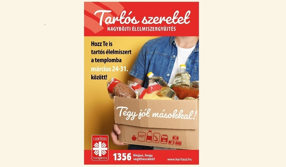 Március 24–31. között rendezték meg hazánk templomaiban a nagyböjti élelmiszergyűjtést. A gyűjtés hetében a templomok mellett a Karitász 16 egyházmegyei központjában, és több gyűjtőponton is fogadták a felajánlásokat.
