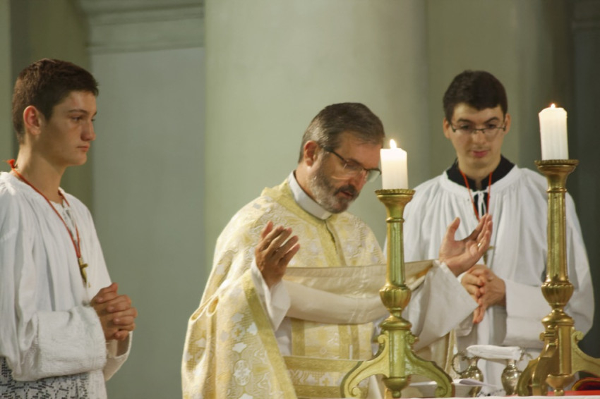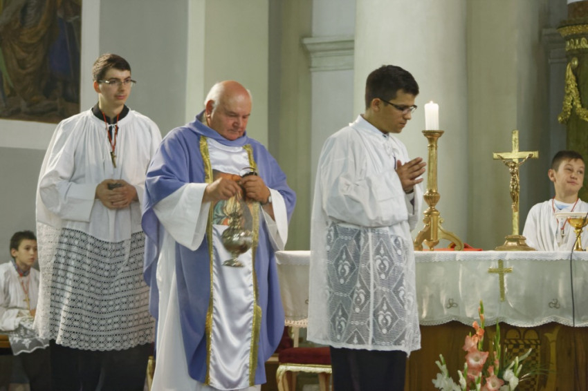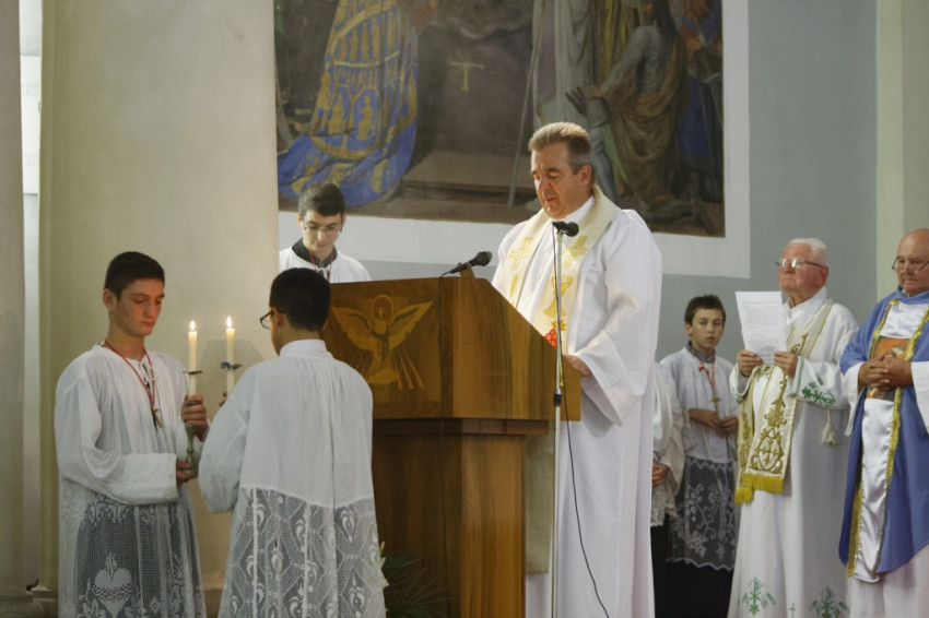 Az ünnepi szentmise előtt a hívek a szervita nővérek vezetésével rózsafüzért imádkoztak Szűz Mária tiszteletére, majd 18 órakor megkezdődött a szertartás a nagytemplomban az asszisztencia, a plébániai tanácsadó testület és a papság ünnepélyes bevonulásával.