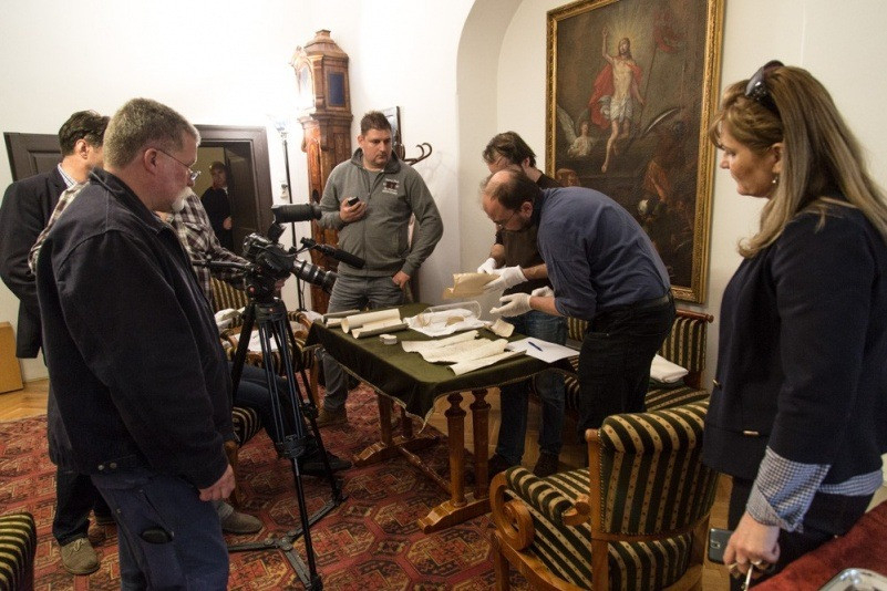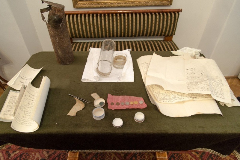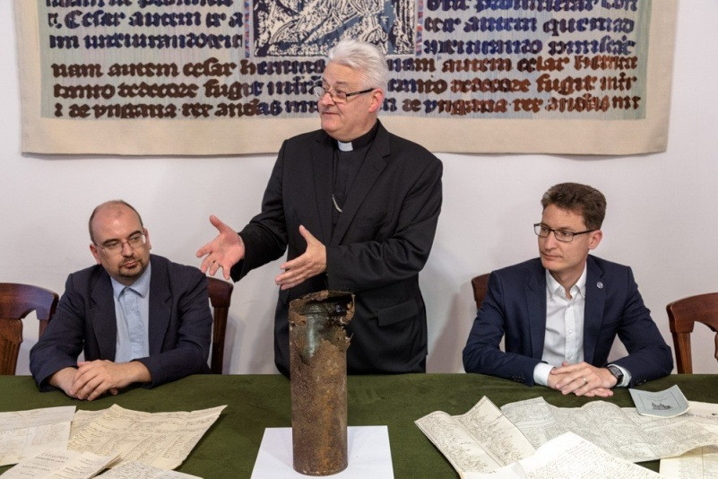 Az időkapszulában megtalált dokumentumok 1807-ből, 1868-ból, illetve 1894-ből származnak, vagyis a székesegyház 19. századi felújításaival kapcsolatos iratokat találták meg benne. Az emlékiratok tartalmazták mind a három évből az egyházmegyei papság névsorát, valamint a város tisztikarának felsorolását. Az 1868-as dokumentumok között találtak még a megye tisztikarát bemutató nyomtatványt, városi közgyűlési határozatot és jelentést, valamint egy emléklapot is. A két későbbi évből származó iratok között megtalálták a tornyon dolgozó munkások neveit tartalmazó listát is, valamint korabeli pénzérmék is kerültek elő. A dokumentumok eredeti példányait digitalizálták, illetve az 1807-es kéziratokon állagmegóvási munkákat végeztek, hogy eredeti formában helyezhessék vissza a keresztbe.