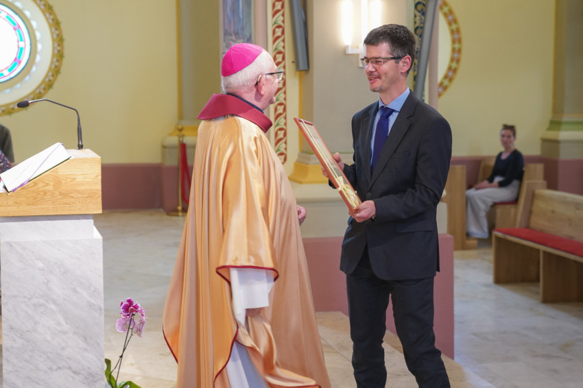 A kaposvári megyéspüspök egy Simon András által készített grafikát ajándékozott az iskolának, amelyet Varga Bálint igazgatónak adott át.