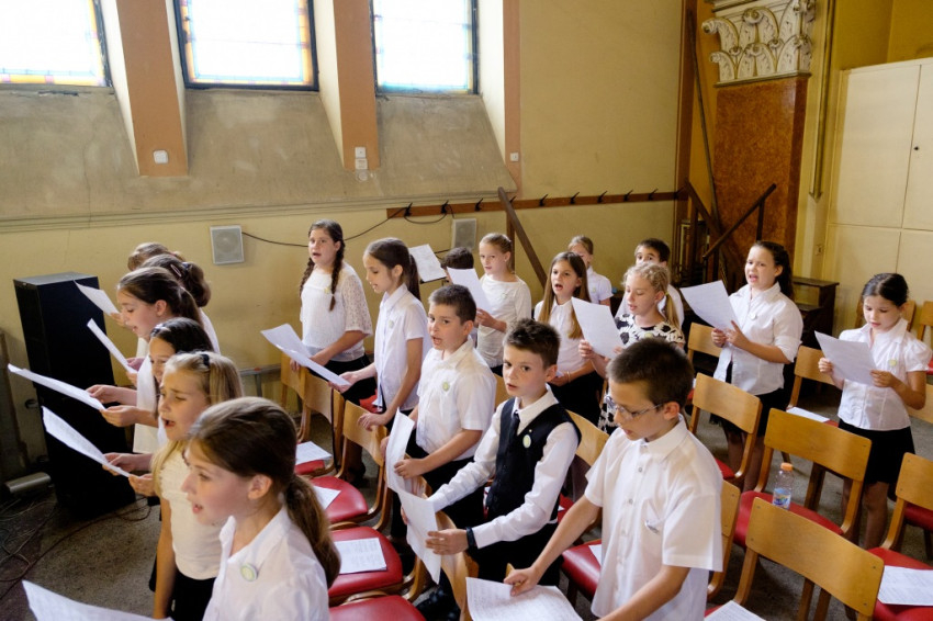 A kórusénekek után köszöntőt mondott Varga Júlia, Laskai Márk és Kalinowski Albert 1. osztályos tanuló, majd Gyönyörű Anna 4.a osztályos tanuló kalotaszegi népdalt énekelt. Ezután William Wordsworth Daffodils című versét Buzás Réka 4.b osztályos tanuló szavalta el, a Gottes Liebe ist so wunderbar című dalt pedig az 5.c osztály adta elő. Túrmezei Erzsébet Szolgálni, mint a fény című versét Magyar Máté 6.a osztályos tanuló mondta el, majd Baráth Éva 8.a osztályos tanuló hegedűjátéka következett, zongorán kísért Deák Gabriella tanárnő. A folytatásban Reményik Sándor A templom és az iskola című verse hangzott el Medvés Erika Bella 8.a osztályos tanuló előadásában. Ezt követte Szalay Zsófia 8.a osztályos tanuló fuvolaszólója (Bartók Béla: Este a székelyeknél).