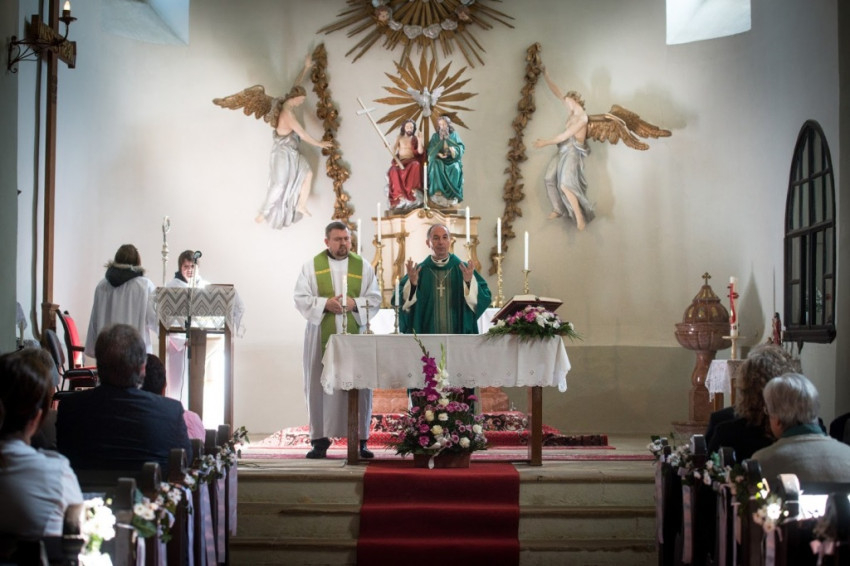 Másnap, vasárnap a templom felszentelésének 250. évfordulóját ünnepelte a falu. A szentmisét két nyelven, magyarul és németül mutatta be Udvardy György pécsi megyéspüspök és Wigand István bonyhádi plébános, német referatúravezető.