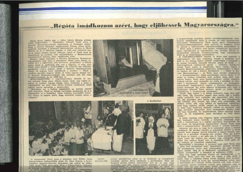 „Régóta imádkozom azért, hogy eljöhessek Magyarországra” címmel számolt be az Új Ember Teréz anya magyarországi látogatásáról 30 évvel ezelőtt. Teréz anya Lékai László bíboros meghívására érkezett hazánkba.