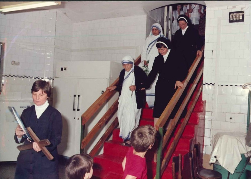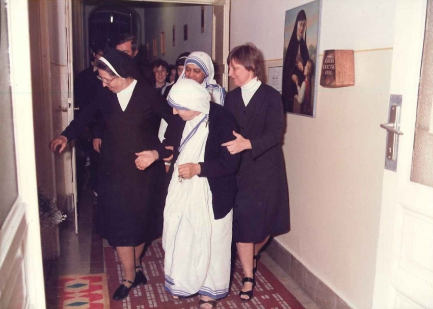 1986. május 26-án, hétfőn este szállt le Budapesten a repülő Teréz anyával, itt a nővérközösség nevében Szobonya M. Jolánta, akkori tartományfőnöknő fogadta. A repülőtérről egyenesen a Boldogasszony Iskolanővérek (akkor még Miasszonyunkról nevezett Szegény Iskolanővérek) Knézich utcai rendházába mentek. Teréz anya az akkori betegszobában kapott szállást. A mai általános iskola udvarára nyíló helyiséget azóta átépítették, itt kapott helyet a lifttorony.