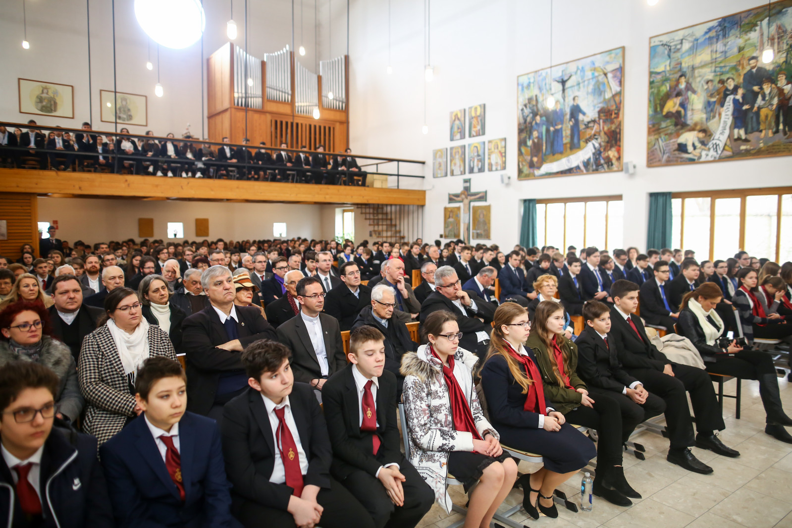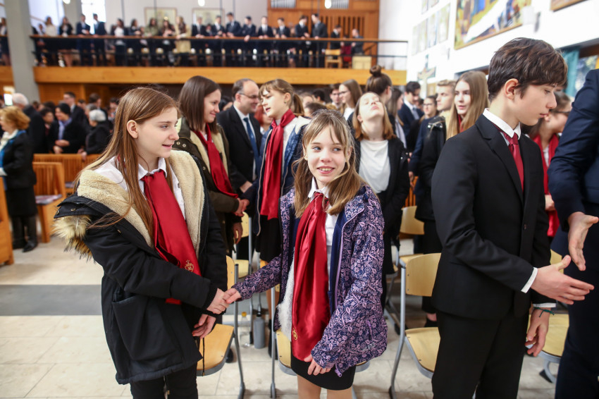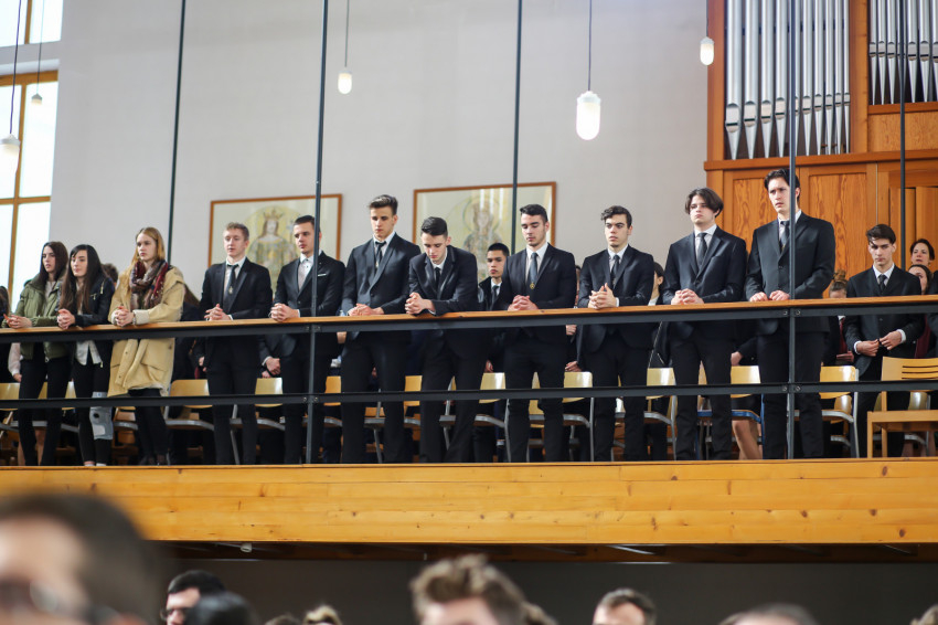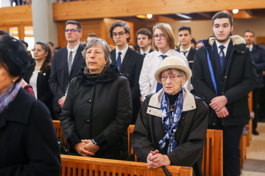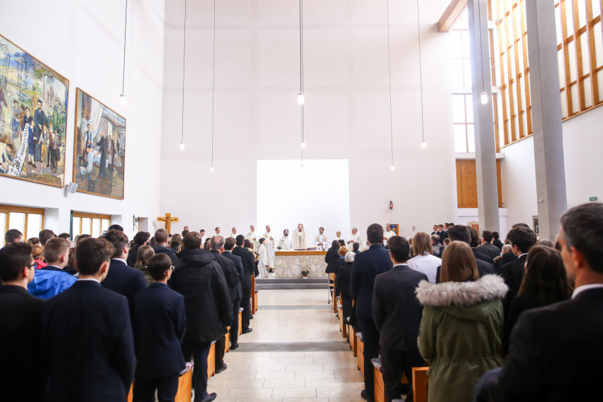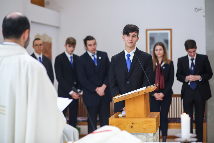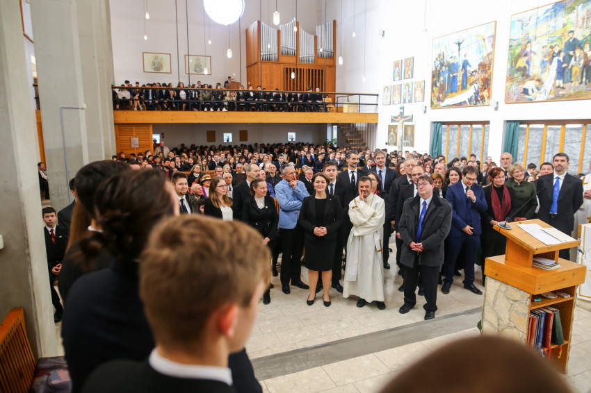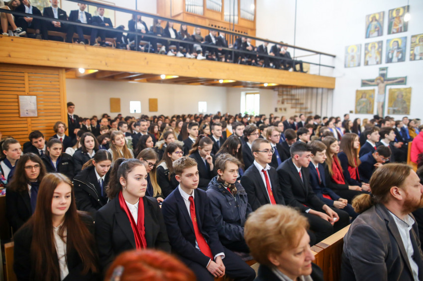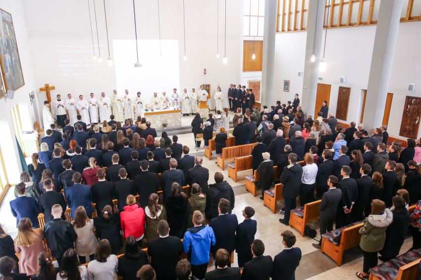 „Meghatottság van bennünk az elmúlt 300 évre visszagondolva, ami még erősebb amiatt, hogy ez a múlt nemcsak a szavak szintjén jelenik meg, hanem vendégeink által is, akik történelmünk újkori időszakához kötődnek” – köszöntötte Keserű György a templomot megtöltő tanár-, diák- és vendégsereget. – A szentmisében szeretnénk megnyílni Isten felé. Gondoljunk azokra, akik mellé itt, az iskolában oda tudunk szegődni, akikkel megoszthatjuk dolgainkat, akik kísérnek bennünket. Így vagyunk Istennel is, próbáljuk meg most kitárni szívünket Isten felé, aki minden szeretet forrása.”