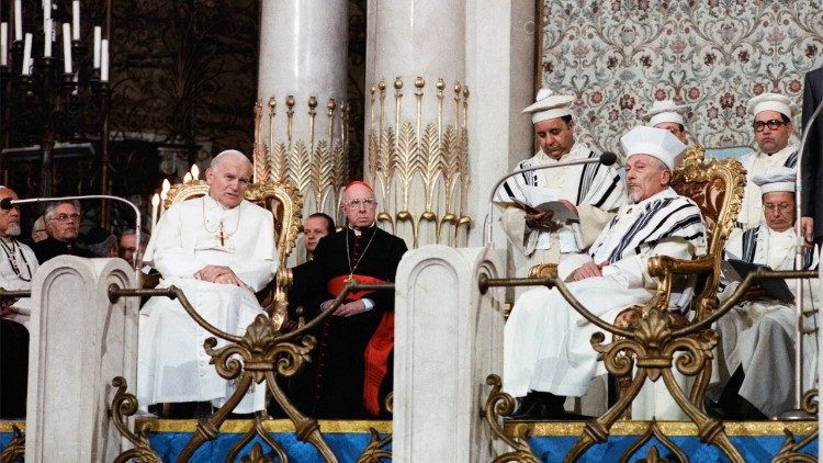 Szent II. János Pál pápát a római zsidó közösség Tiberis-parti nagytemplomában Elio Toaff főrabbi és Giacomo Saban, a római izraelita közösség elnöke köszöntötte. „Zsidó és keresztény testvérek!” – szólította meg a római pápa a jelenlévőket a katolikus egyház egyetemes pásztoraként, ami azonnal jelezte, hogy a kapcsolat, a látogatás alapja a közös ábrahámi hitben való testvériség. Elmondta, a Gondviselés sugallatára érkezett ide, hogy a nagytemplomukban találkozzon a zsidó közösséggel, mely ebben a városban él az antik időktől fogva, hogy „együtt gondolkozzon az Örökkévaló jelenlétében Róma püspöke és zsidó közössége találkozójának a jelentőségén”.
