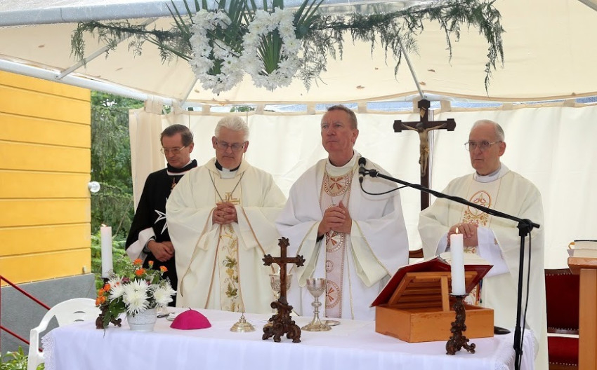 A sűrű esőzésben kezdődő szabadtéri szentmise elején Beer Miklós püspök köszöntötte az egybegyűlteket. A körülmények feledhetetlenné teszik az ünneplést – utalt Beer Miklós a szakadó esőre, majd hozzátette: Emlékeztessen az égi áldás keresztségünkre, arra, hogy megújuló szívvel kell vállalnunk a szeretet szolgálatát.