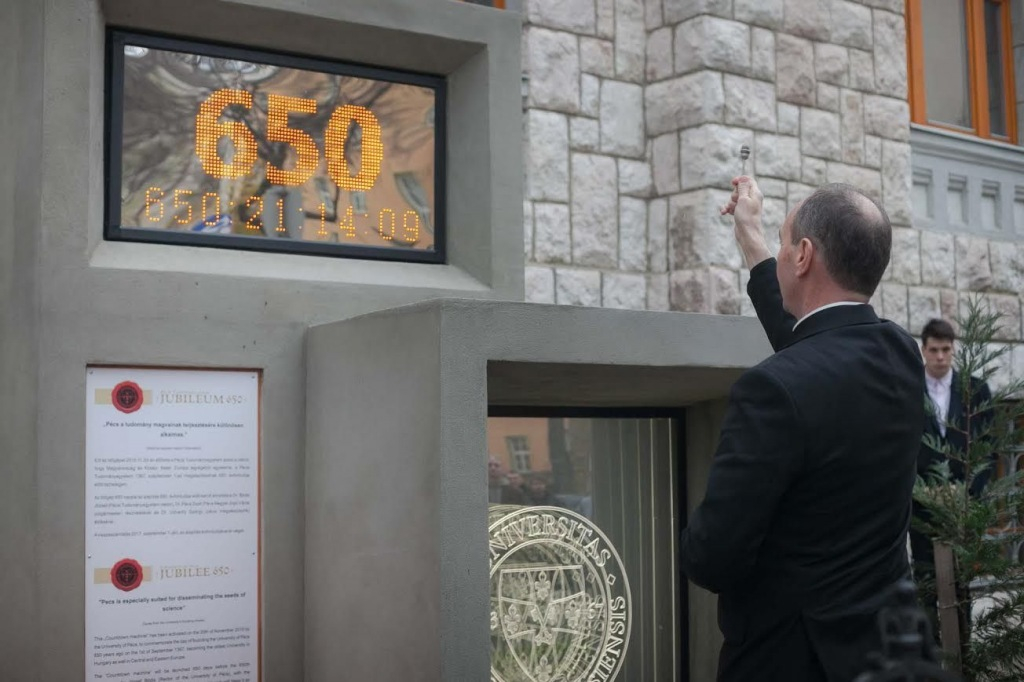 Az 1367-ben V. Orbán pápa által engedélyezett és Nagy Lajos király által alapított felsőoktatási intézmény jubileumi nyitóünnepségén visszaszámláló időgépet avattak, valamint együttműködési megállapodást írt alá Udvardy György megyéspüspök, Páva Zsolt, Pécs polgármestere és Bódis József, a Pécsi Tudományegyetem rektora.