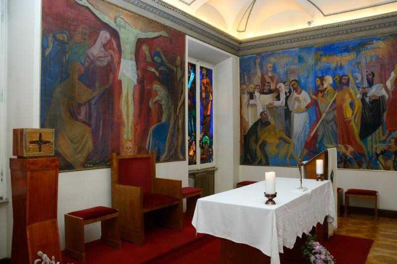 Az Intézet a háborút követően nehéz időszakot kellett, hogy átéljen. Luttor Ferenc, az első rektor már nem sokáig vezethette a PMI-t. A háború utáni zavaros helyzetben, a gyorsan erősödő kommunista diktatúra miatt Argentínába kényszerült emigrálni, helyét 1947-ben Péterffy Gedeon, majd 1951-ben Mester István, 1953-ban pedig hosszabb időre régensi minőségben Zágon József vette át. Ebben az időben az Intézet nem fogadhatott többet Magyarországról növendékeket, és napi rendszerességgel a létéért kellett küzdenie a diktatúrával. A PMI ekkor a hazájukat elhagyni kényszerült egyháziak menedékhelyévé vált. Ekkor lett néhány évre a hazáját szintén elhagyni kényszerült Prokop Péter (1919–2003) kalocsai főegyházmegyés pap festőművésznek is otthona a palota II. emelete. Prokop 1958-ban festette ki a kápolnát. Ekkor lett a kápolna titulusa Szent Kereszt felmagasztalása, de nemcsak az, hanem a 137. zsoltár ott ábrázolt jajkiáltása „Ott ültünk Babilon folyóvizei mellett és sírtunk […] A fűzfákra akasztottuk ott hangszereinket”, valamint az ábrázolt magyar és magyar vonatkozású szentek is kétségkívül az 1956-os magyarországi eseményekre emlékeztették azt, aki a kápolnában imádkozott.