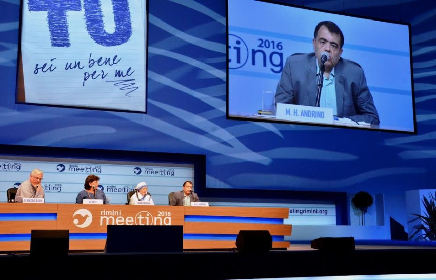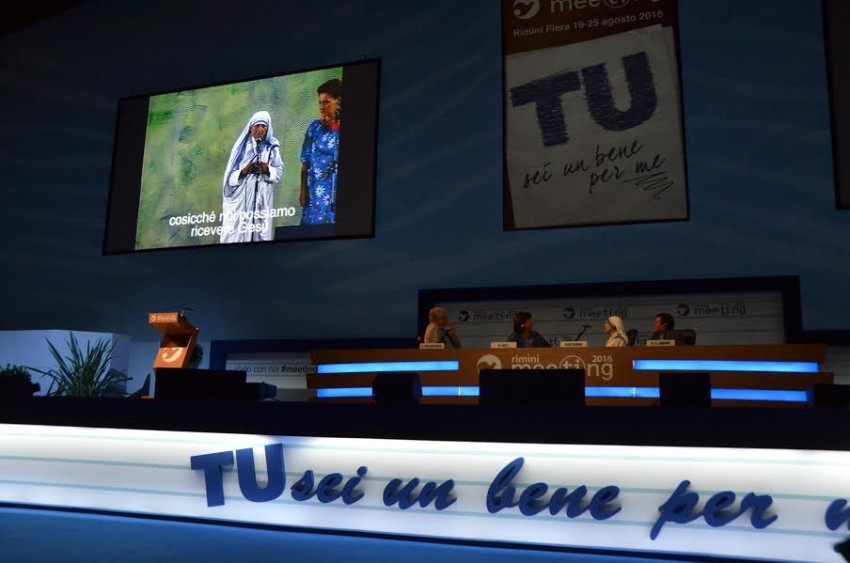 Suor Serena, a Szeretet Missziorániusai rend tagja elmondta, hogy 29 évvel ezelőtt ő is itt volt a Rimini Meetingen. Kevés részletre emlékszik, mert lekötötte minden figyelmét, hogy Teréz anyát kísérte. Felidézte, hogy miközben sok rózsafüzért szétosztottak, a sajátja valahogy elkallódott. A szervezők viszont a talált tárgyak között azóta megőrizték, és most, amikor kiderült, kié, Serena nővér legnagyobb meglepetésére ünnepélyesen visszaadták. A találkozó végén levetítették az 1987-es látogatáskor készült felvételt, a Teréz anya által akkor elmondott Üdvözlégybe bekapcsolódott a több ezer jelenlévő az olaszországi földrengés áldozataiért imádkozva.