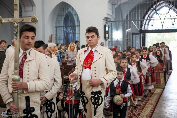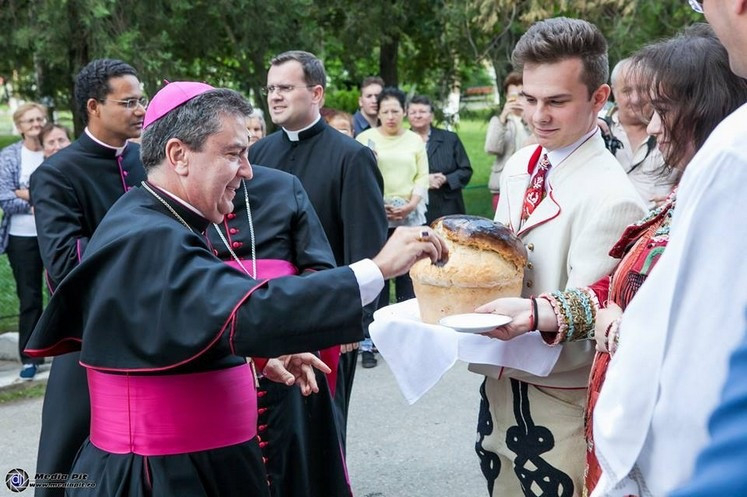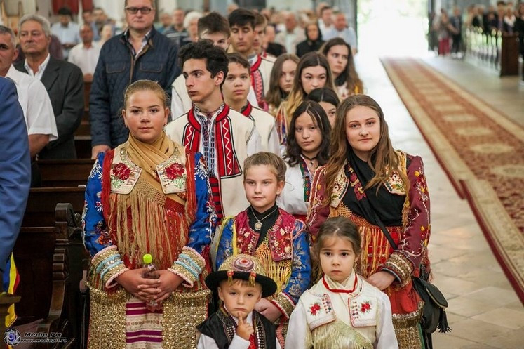 A zömében bolgár nemzetiségű vingai közösség fiataljai – de az idősebbek közül is sokan – népviseletbe öltözve fogadták május 19-én a templomhoz érkező apostoli nunciust, akit kenyérrel és sóval kínáltak.