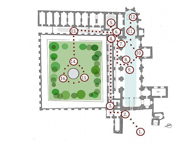 A Virtuális séta menü alatt a gyöngyösi ferences könyvtár két szintjének alaprajzát láthatjuk; ha a kurzort az egyes számok fölé helyezzük, feltűnik az épület adott részletét bemutató fotó, amely klikkelésre kinagyítható. A Helyszínek felirat melleti kis nyílra kattintva lenyílik az alaprajzon kiemelt, jelentősebb épületrészletek listája – legizgalmasabb pontja talán a hatos számú: „Az elfalazott lépcsőfeljáró”, ahol a gyűjtemény sok kincse vészelte át az üldöztetés idejét.