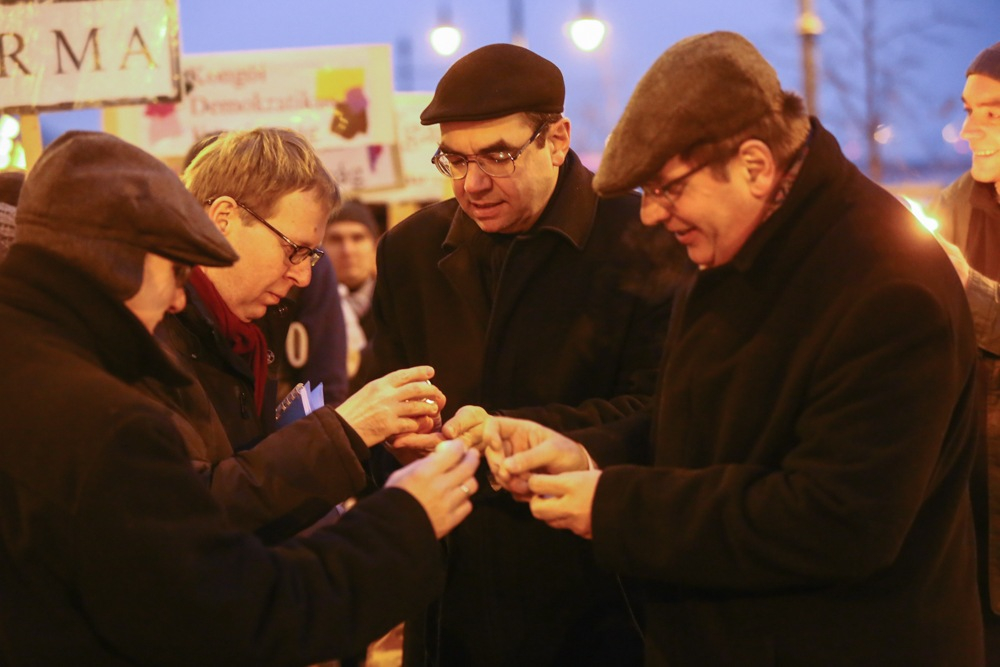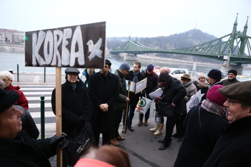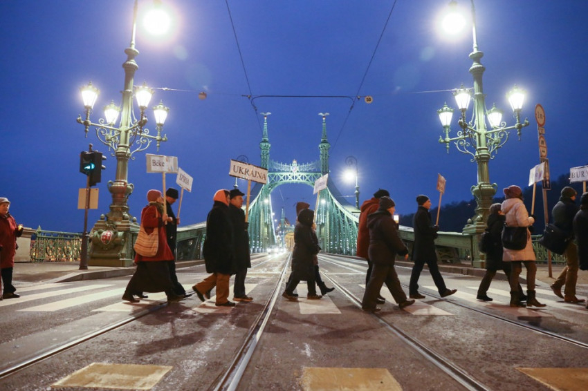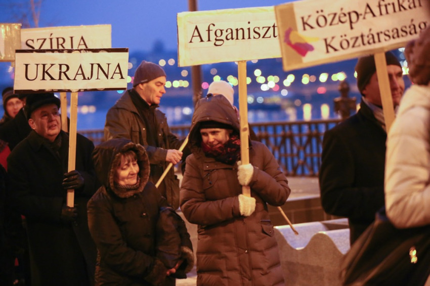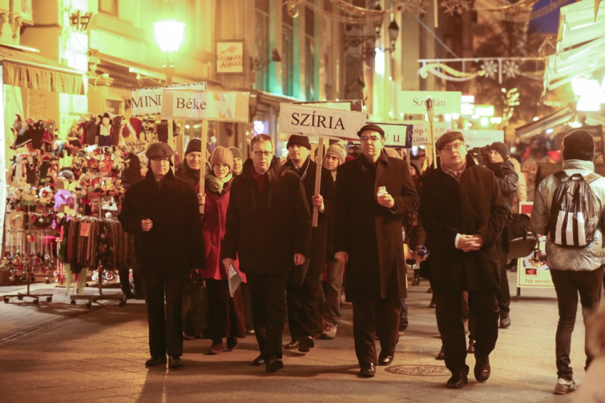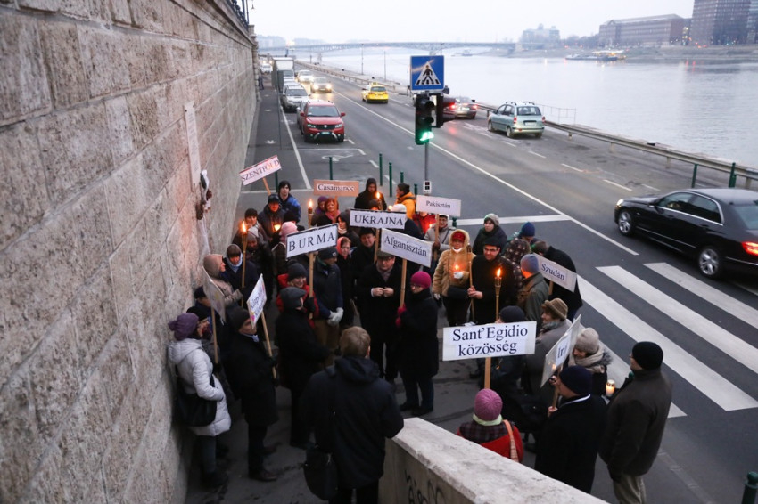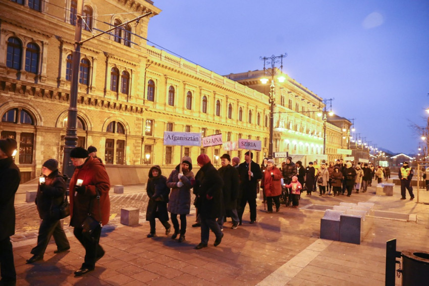 A résztvevők Budapesten a Salkaházi Sára rakparton, a vértanú szerzetesnővér emlékét őrző márványtáblánál gyújtották meg mécseseiket. Szőke Péter, a Szent Egyed közösség magyarországi vezetője felolvasta az Irgalmasság nagyobb, mint a közöny című békekiáltványt, amellyel közösségük csatlakozik Ferenc pápa szándékához. „Miközben a béke lépésével kezdjük az új esztendőt itt és a világ megannyi pontján, szeretnénk, ha Ferenc pápa felhívása meghallgatásra találna: »váljon az irgalmasság, a szolidaritás valódi életprogramunkká«. Vállaljuk, hogy ezt tettekre váltjuk azokból kiindulva, akiket Ferenc pápa üzenetében megjelöl: »az idegenekből, betegekből, foglyokból, hajléktalanokból«” – szóltak a felhívás szavai. A rakpartról a menet a Váci utcai Szent Mihály-templomig vonult fáklyákkal, mécsesekkel és transzparensekkel, amelyeken a háború sújtotta országok nevei szerepeltek.