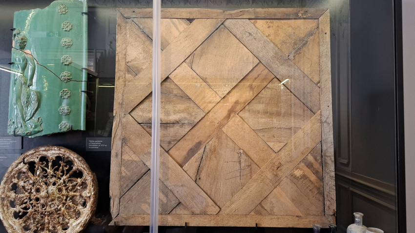 Az első emeleten, a balkonszalonban építéstörténeti kiállítást láthatunk. A feltárás során különféle tárgyak kerültek elő, például a főépületből egy táblás parketta 1777-es évszámmal, egy vasból készített szellőzőrács a 19. századból és egy rozsdás, mégis díszes, rózsaablakra emlékeztető, kör alakú szellőzőrács ugyanebből az időből.