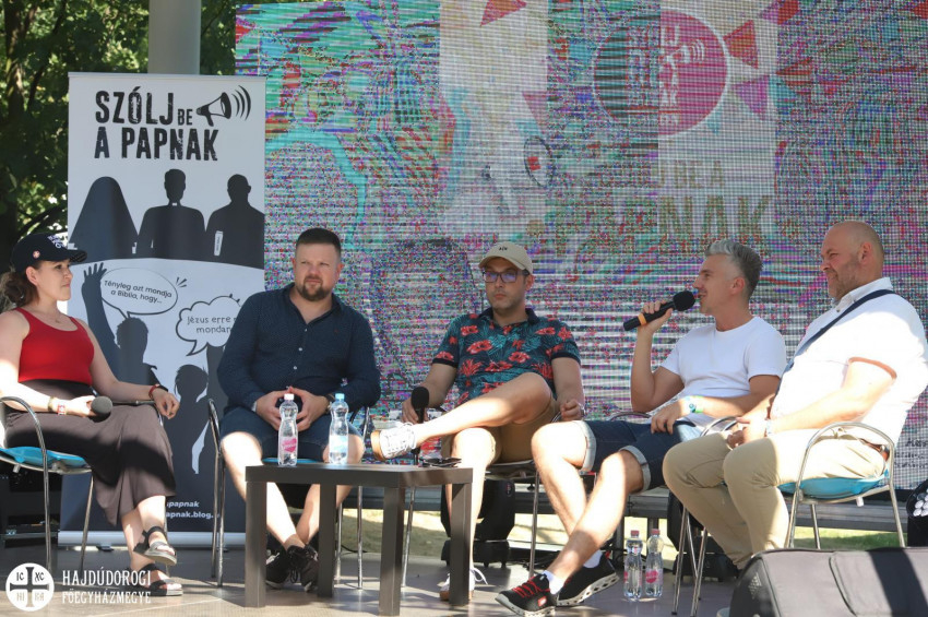 A beszélgetés végén most is szót kaphatott a közönség, ezúttal azonban nem záporoztak a kérdések, szívesebben folytattak személyes beszélgetéseket a résztvevők a „Szólj be a papnak!” sátránál.