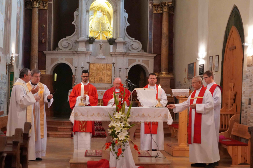 Pécsett szentmisével kezdtük meg a látogatásunkat, és Felföldi László pécsi megyéspüspökkel együtt a Pécsi Egyházmegye alapításának 1012. évfordulójára emlékeztünk. A szentmisét Palánki Ferenc celebrálta, amelyen mindkét egyházmegye papsága és a pécsi hívek is részt vettek.