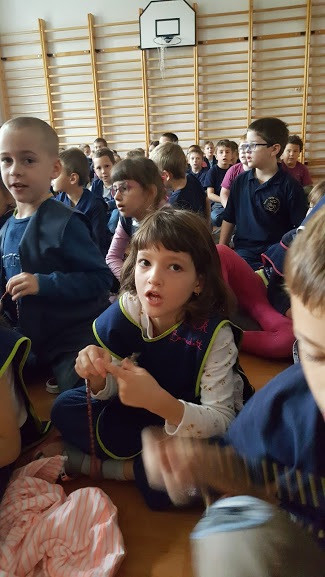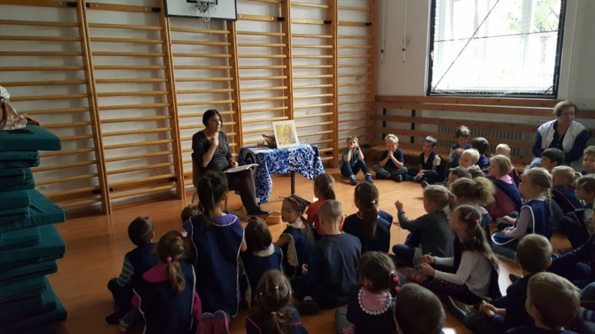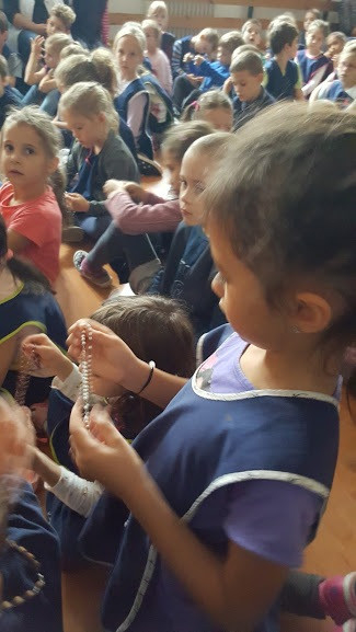 A legkisebbek, az elsősök és másodikosok Mezei Csilla hitoktató, tanító vezetésével a tornaszobában imádkoztak el egy tized rózsafüzért Szűz Mária képe előtt. A tanító minden Üdvözlégy előtt egy táblára írt imaszándékot (béke, családi béke, engedelmesség, szolgálat, szép beszéd, barátság, ajándékozás, szorgalom, őszinteség, imádkozás) mutatott fel. Minden Üdvözlégy után egy gyöngyszemet tett egy-egy gyermek Mária elé. Az imádság után a tanítók az ima és a béke fontosságáról beszélgettek a gyerekekkel.