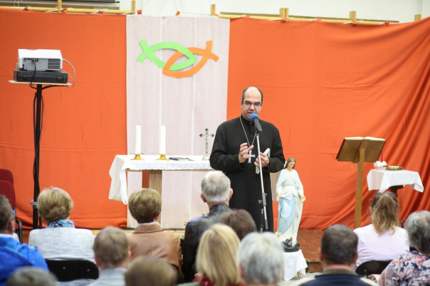A szép házasság alapképlete: ketten hármasban – a főpásztor a szentbeszédben már Gyökössy Endre szavaival fonta tovább gondolatmenetét. Két ember egymás iránti szeretete egy hatalmas szikla, ha ezen állnak, akkor fentről nézve minden más apró kavicsnak tűnhet, ám ha ez a szikla szétrepedezik, akkor a két ember lehuppan a földre, és a hétköznapi problémákon sem tud olyan könnyedén úrrá lenni. Ezt a sziklát folyamatos figyelemmel lehet erőssé tenni, a férj például ha egy életen át tud udvarolni, a feleség ha nem sértődik meg nehéz helyzetekben, hanem bölcsen jelzi, hogy mi a probléma. De ugyanígy a gyermekek is részei a családnak, ő rajtuk ugyanúgy áll a családi békesség – tette hozzá.