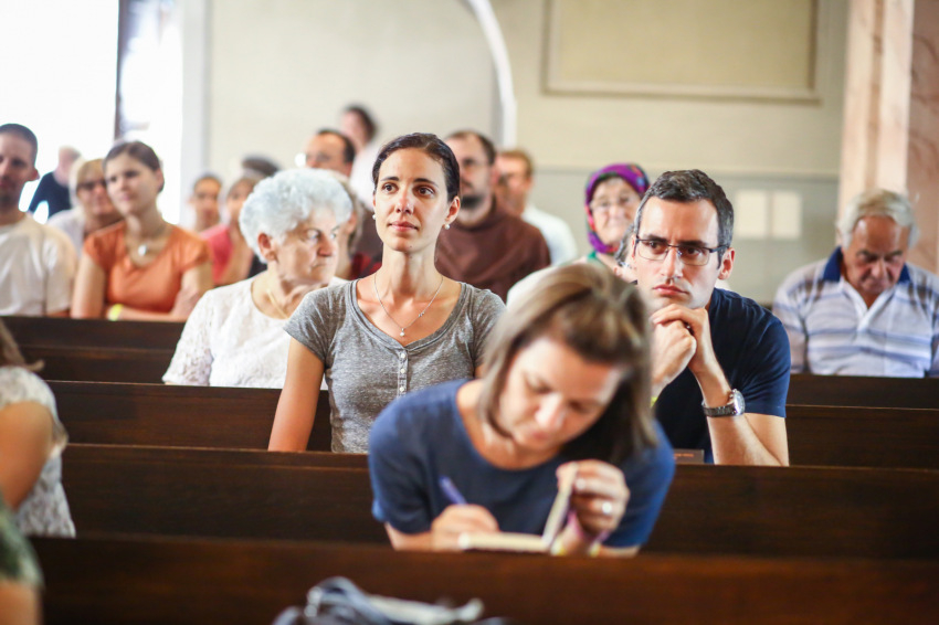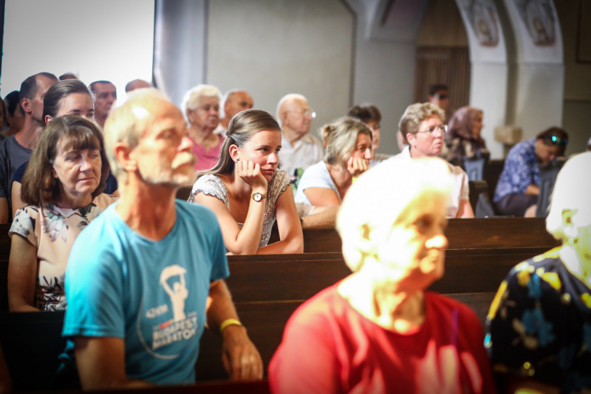 A templom azonban még majdnem üres, a csend szinte megüt. Egy pillanatra elbizonytalanodunk, hogy jókor vagyunk-e jó helyen. Amikor körülbelül tíz perc múlva a kegyhelyigazgató két fiatalemberrel együtt az oltár elé lép, még úgy tűnik, az alkalom egészen intim, baráti találkozáshoz hasonló lesz. Ez bizonyos értelemben be is igazolódik, egyet kivéve: nem tudom, milyen fázisokban, mert nagyon figyelem az előadókat, de észrevétlenül megtelik a templom (jól meg is lepődöm, amikor fél óra múlva hátratekintek), és amikor a kérdésekhez érünk, az érdeklődés intenzitása is nyilvánvalóvá válik.