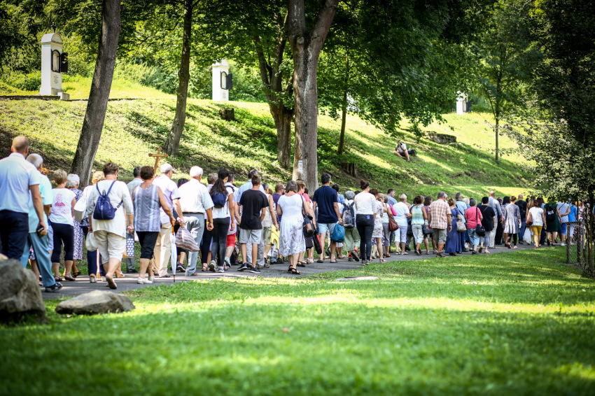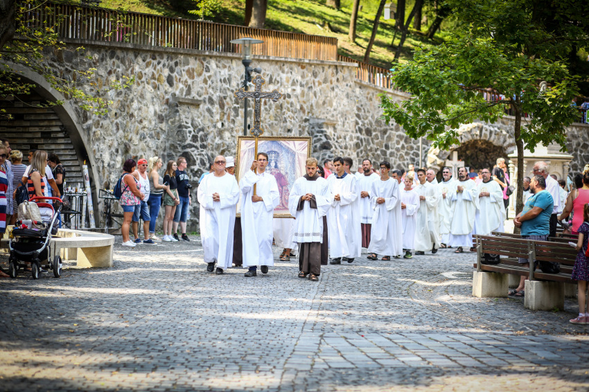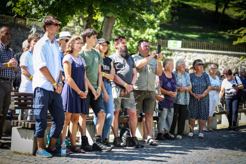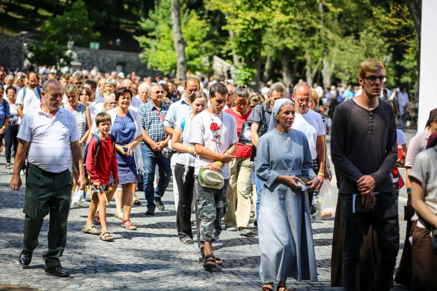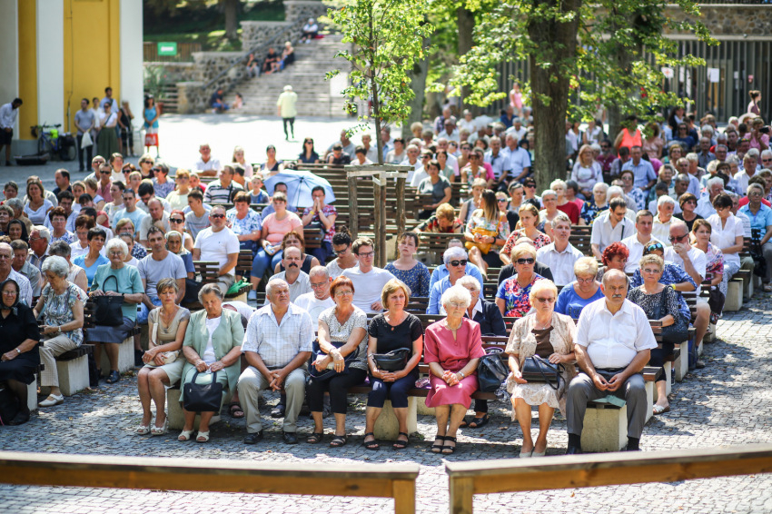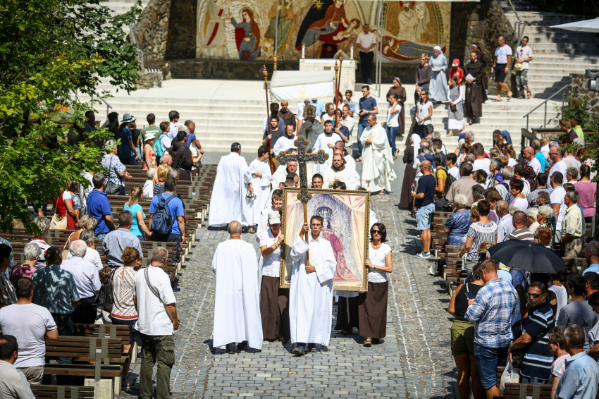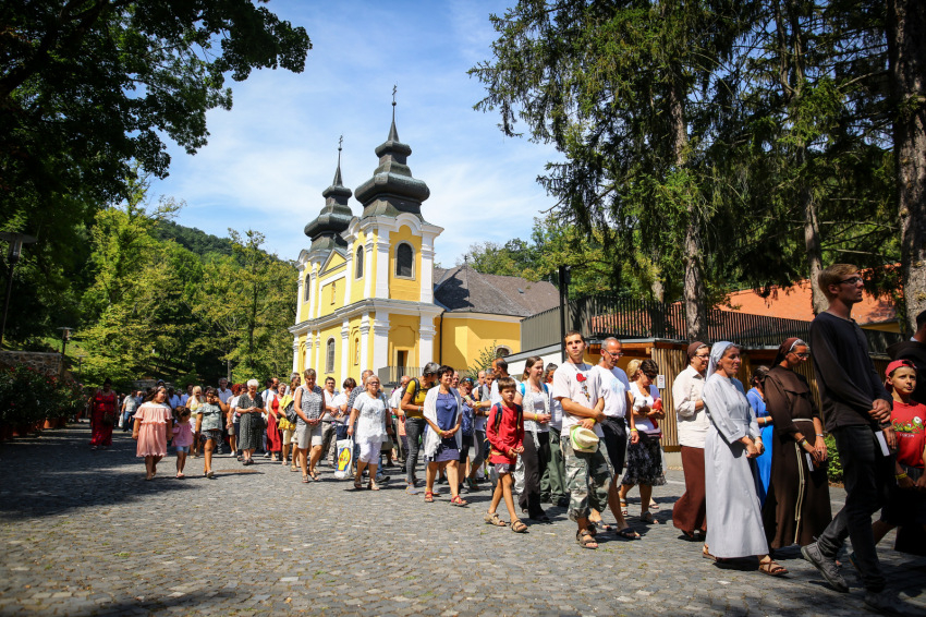Háromnegyed kilenc sincs még, amikor a kegyhelyre érünk. A kocsiból kémlelve minden szokatlanul csendesnek tűnik. A reggeliidő a vége felé jár; a parkolóból már látszik, hogy az étkező színültig tele: ekkor a tömeg nagysága és a zarándokok frissessége, ami meglep. Hiszen sokak mögött áll ötnapi gyalogút – a többség Esztergomból érkezhetett tegnap délután.