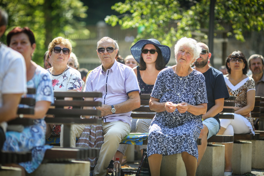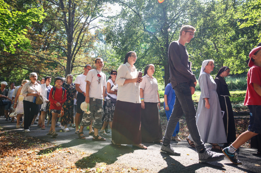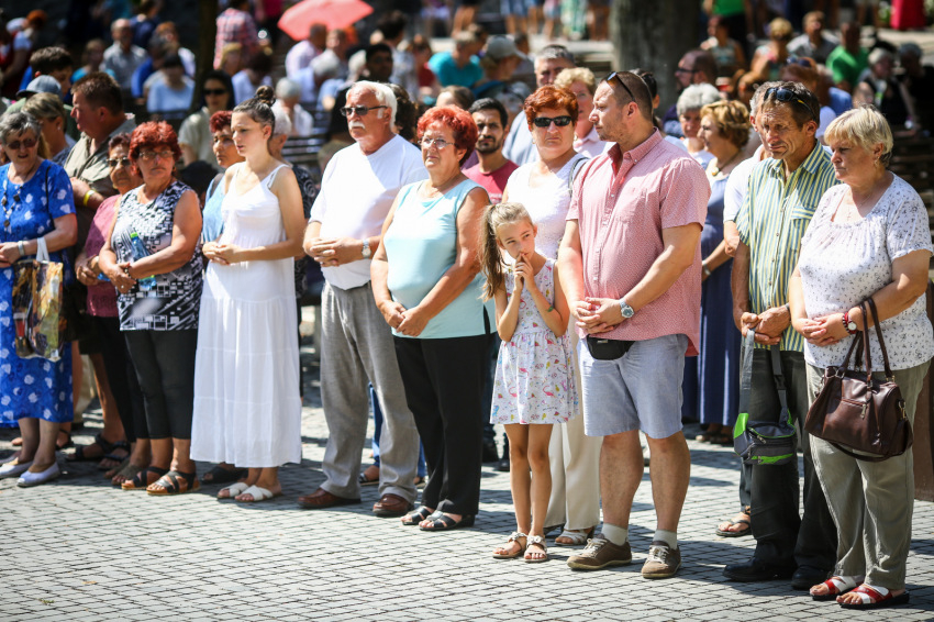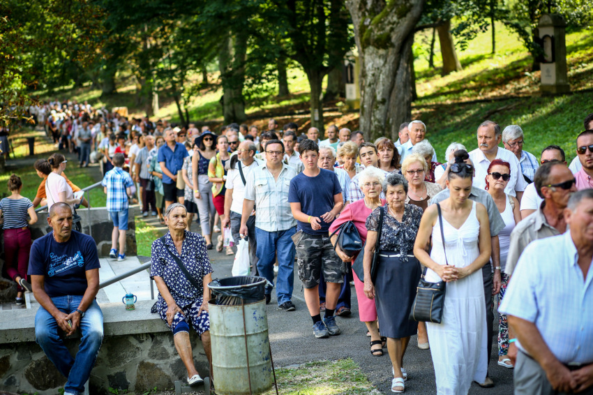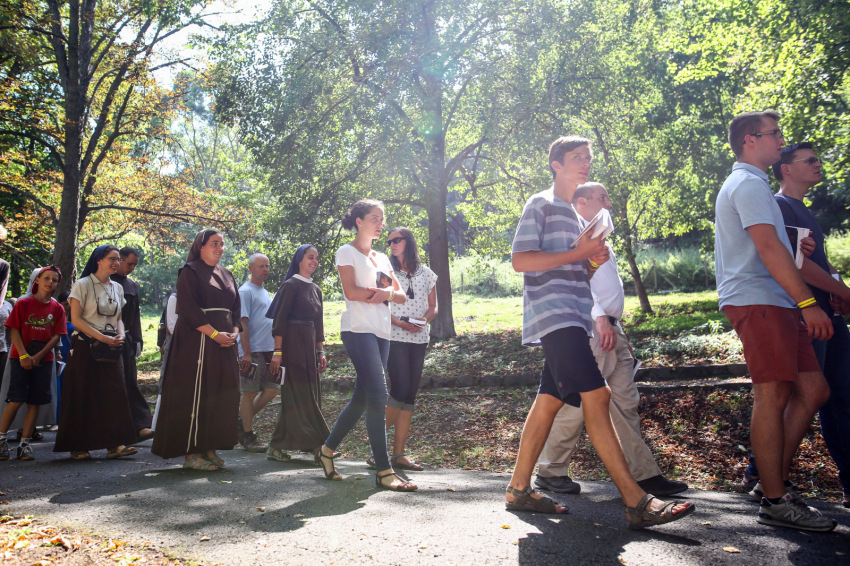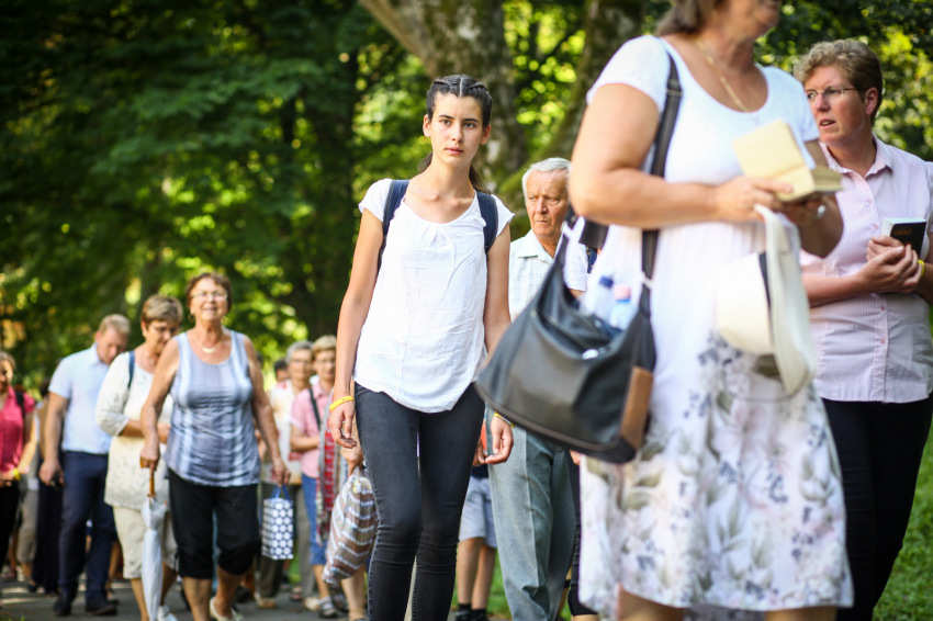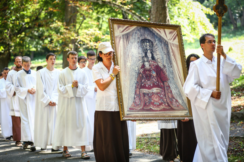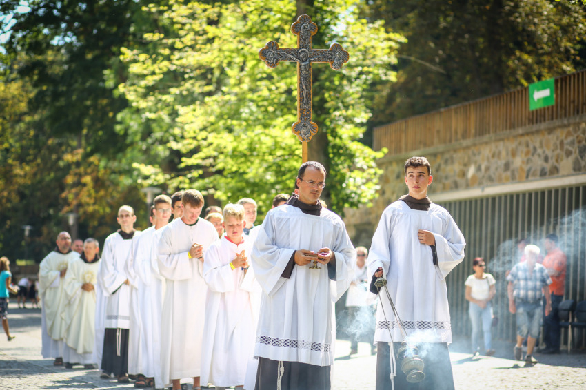 Háromnegyed kilenc sincs még, amikor a kegyhelyre érünk. A kocsiból kémlelve minden szokatlanul csendesnek tűnik. A reggeliidő a vége felé jár; a parkolóból már látszik, hogy az étkező színültig tele: ekkor a tömeg nagysága és a zarándokok frissessége, ami meglep. Hiszen sokak mögött áll ötnapi gyalogút – a többség Esztergomból érkezhetett tegnap délután.