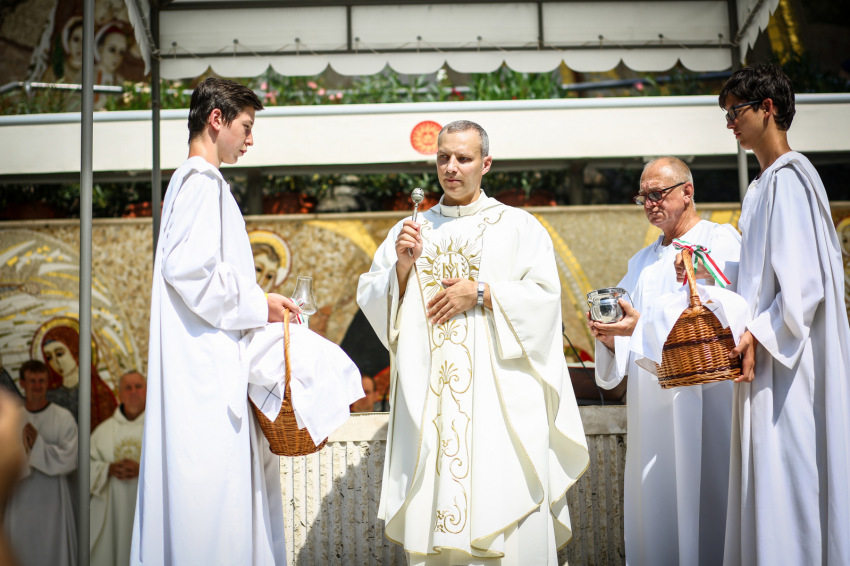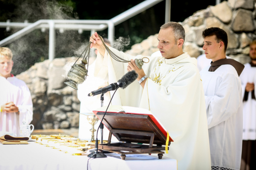 A 11-kor kezdődő ünnepi szentmisét a júniusban szentelt Bucskó Nándor ferences szerzetes mutatja be. Római élményével kezdi a prédikációját. A Pantheon nevű, kör alakú templomról mesél, amely már a kereszténység előtti korban is létezett, és „minden isten templomának” nevezték. A mai Európa egy nagy Pantheon: egyrészt mert bármilyen vallást nehézség nélkül gyakorolhatunk, és mert a különböző pszichológiai iskolák, a kínálkozó élmények és élvezetek sokak számára olyasfélék lettek, mint a vallások. Mit tud ennek a világnak kínálni a kereszténység? Pált, amikor az ismeretlen isten oltáránál a világ teremtőjéről és fenntartójáról beszélt Rómában, egyetértéssel hallgatták a bölcsek, ám amikor Fiára, a feltámadt Jézus Krisztusra tért át, kinevették és otthagyták. Hitünk központi igazsága éppen ő: egy élő személy, akivel kapcsolatba lehet kerülni.