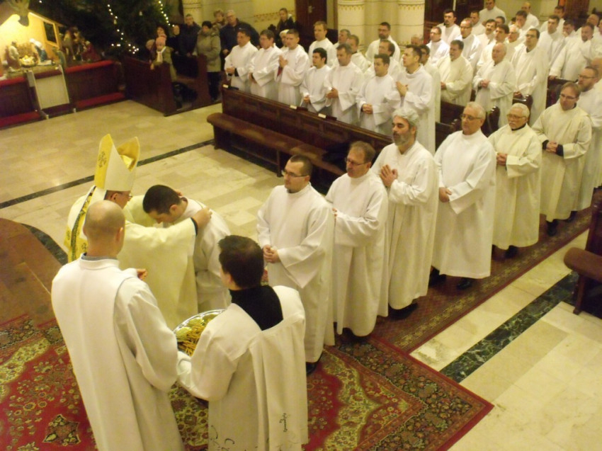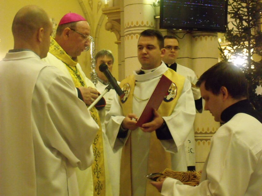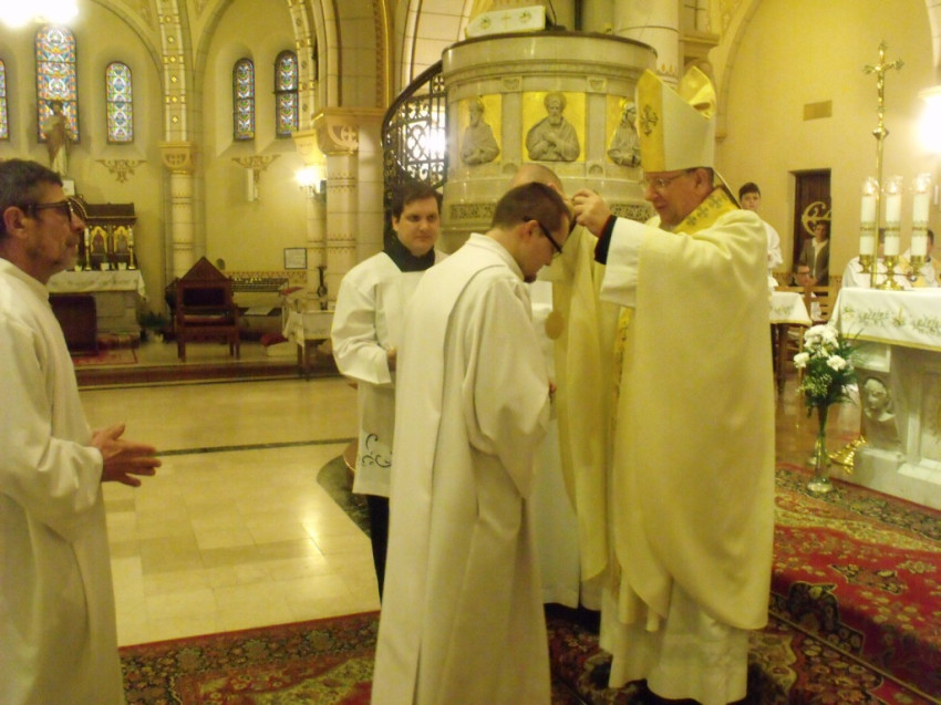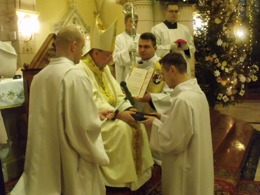 A homíliát követően a jelöltek előléptek, a megáldott liturgikus ruha fölvétele után egyesével a főpásztor elé járultak, és átvették tőle a Szentírást.