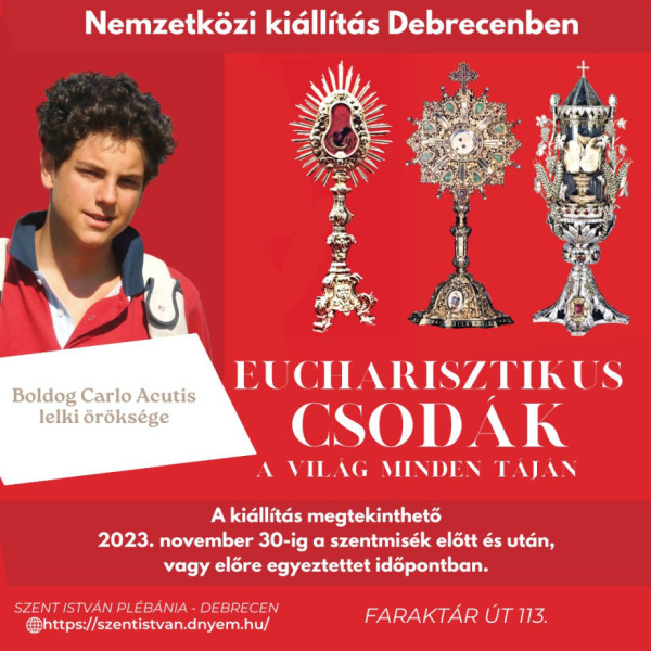 Október 15-én nyitotta meg Papp László plébános az Eucharisztikus Csodák a világ minden táján című, Boldog Carlo Acutis lelki örökségét bemutató kiállítást, mely november végéig – a szentmisék előtt és után, illetve előre egyeztetett időpontban – tekinthető meg a debreceni Szent István-templomban.