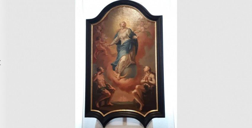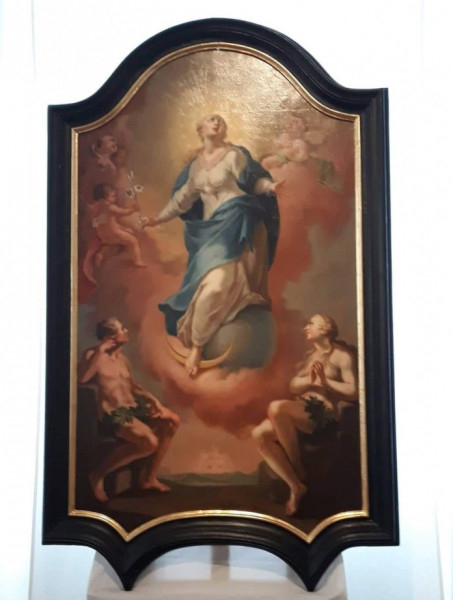 A Mária-festményen a Szeplőtelen Szűzanya látható, amint egy liliomot (a szűzi tisztaság jelképét) vesz át. Mária feje körül tizenkét csillag, lába alatt a holdsarló és a világmindenséget jelképező kék gömb. A 17–18. században a pestisjárványok idején terjedtek el a hasonló Mária-ábrázolások. A népi felfogás szerint a halálszeplőnek is nevezett pestistől a bűn szeplőjétől mentes Szűzanya képes megóvni. Ádám és Éva alakja is az ősbűnnel összefüggésben került a képre.
