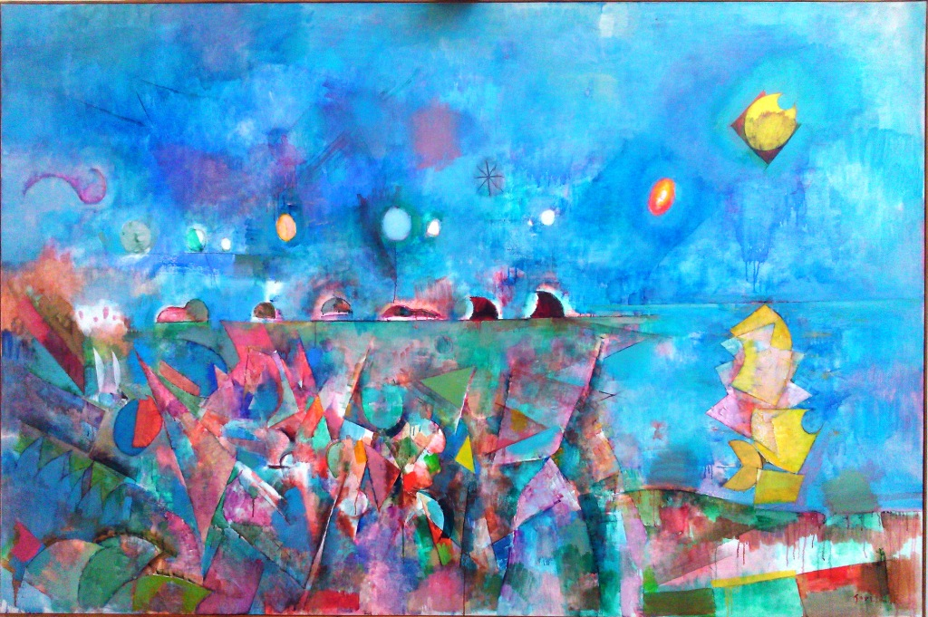 A Balaton című nagy vászon Gerzson Pál egyik fő műve. Hatalmas nagy kékségben olvad össze az ég és a föld, csak középtájt egy vékonyka vonal jelzi a Balaton horizontját. Jó nagy hold és mindenféle csillagok népesítik be az égboltot, jobb oldalon pedig egy sárga vitorlás stilizált képe hívja fel magára a figyelmet. Óhatatlanul Egry Aranykapu című alkotása juthat eszünkbe.