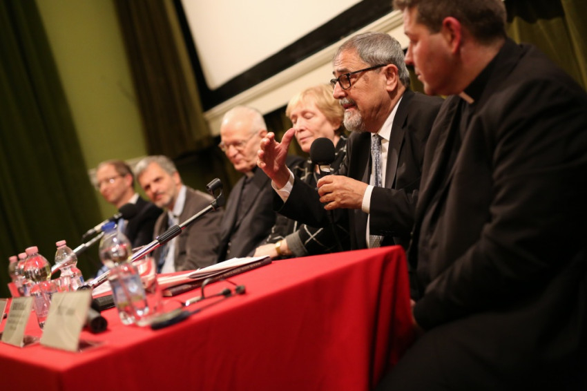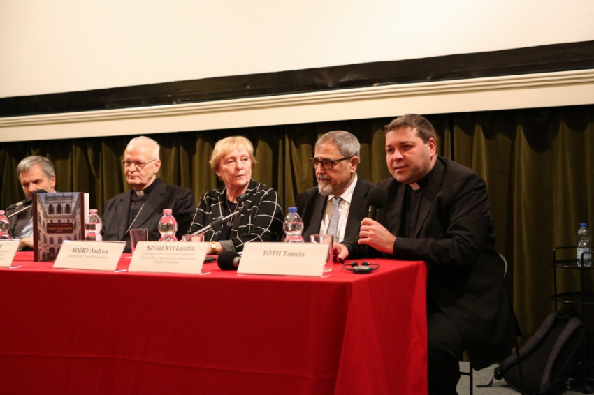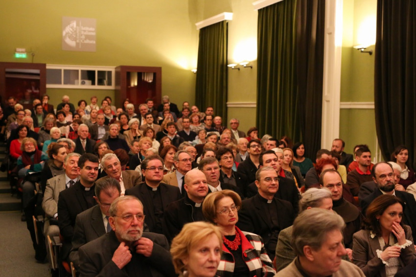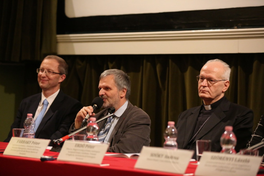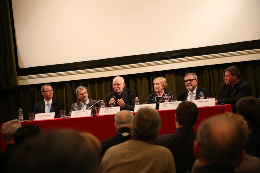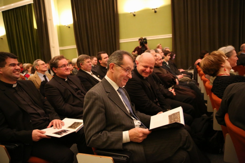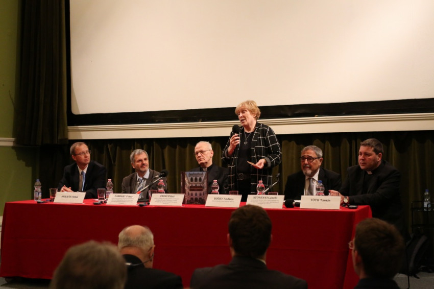 Erdő Péter bíboros, aki egykor maga is növendéke volt a Pápai Magyar Intézetnek, annak egyházban, egyháztörténelemben betöltött szerepéről tartott előadást. Mint mondta, nagy örömmel vette kézbe a most megjelent reprezentatív kötetet, amely felidézte benne az első alkalmat, amikor a Pápai Magyar Egyházi Intézetnek helyet adó második emeletre ment föl. Felérve azonnal azt az emléktáblát látta meg, amely arra emlékezteti a látogatót, hogy XIII. Leó a megválasztása előtti napokban itt szállt meg: a palota egyháztörténeti kapcsolatai tehát nem az intézet megalapításával kezdődtek el. A bíboros is megemlítette, hogy bárki, akinek megmutatja az épületet, csodálkozik azon, hogy a magyar állam és az egyház ilyen gyönyörű épület tulajdonosa lehet Rómában. Kiemelte, hogy az állam és az egyház együtt vett részt az intézmény megalapításában, hiszen 1927-ben a vallásalap pénzét is fölhasználták a palota megvásárlásakor, így kapott helyet benne a papi osztály. Az azóta eltelt időszakok hullámzó együttműködése, illetve a szocializmus idején, az 1964-es megegyezésig tartó ellenséges időszakban az állam ellenállása, a rendszerváltozás óta eltelt időszakban pedig a kapcsolat pozitív alakulása e könyvben nyomon követhető, a kötet megjelenése pedig az együttműködés megvalósulásának tekinthető.