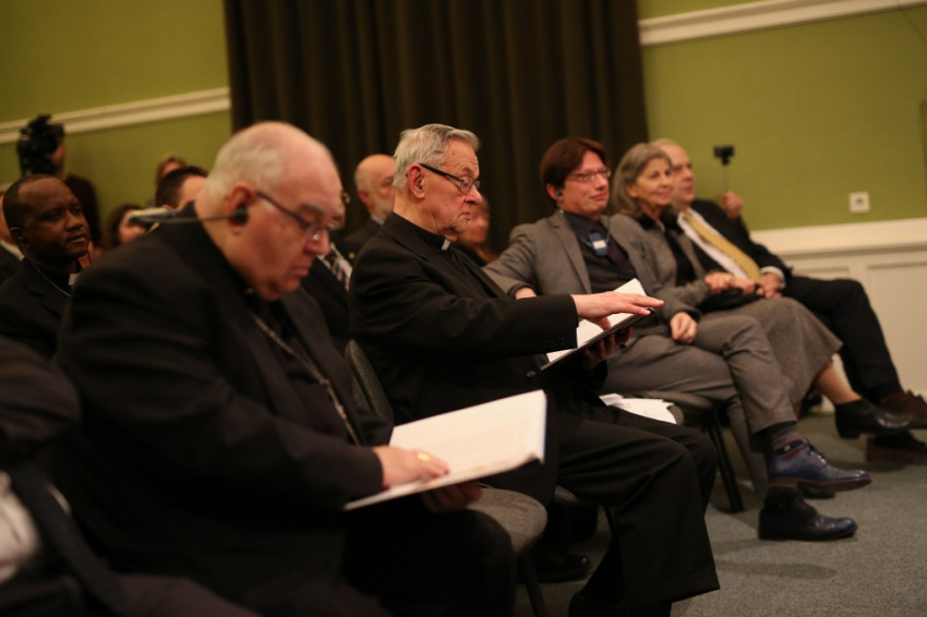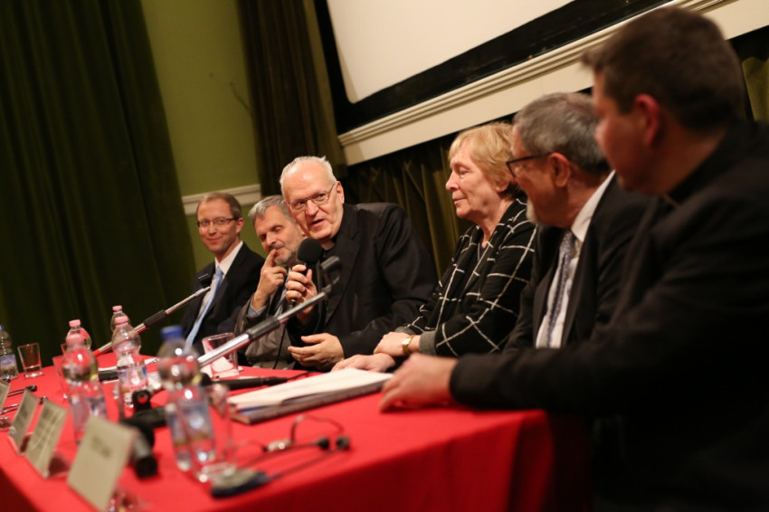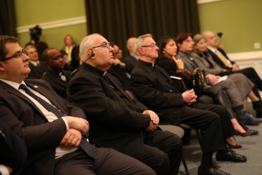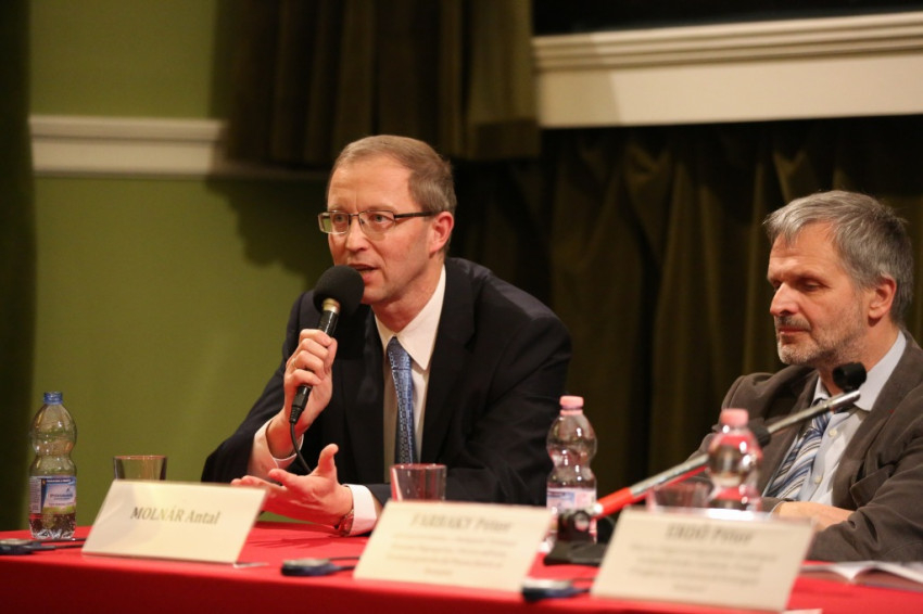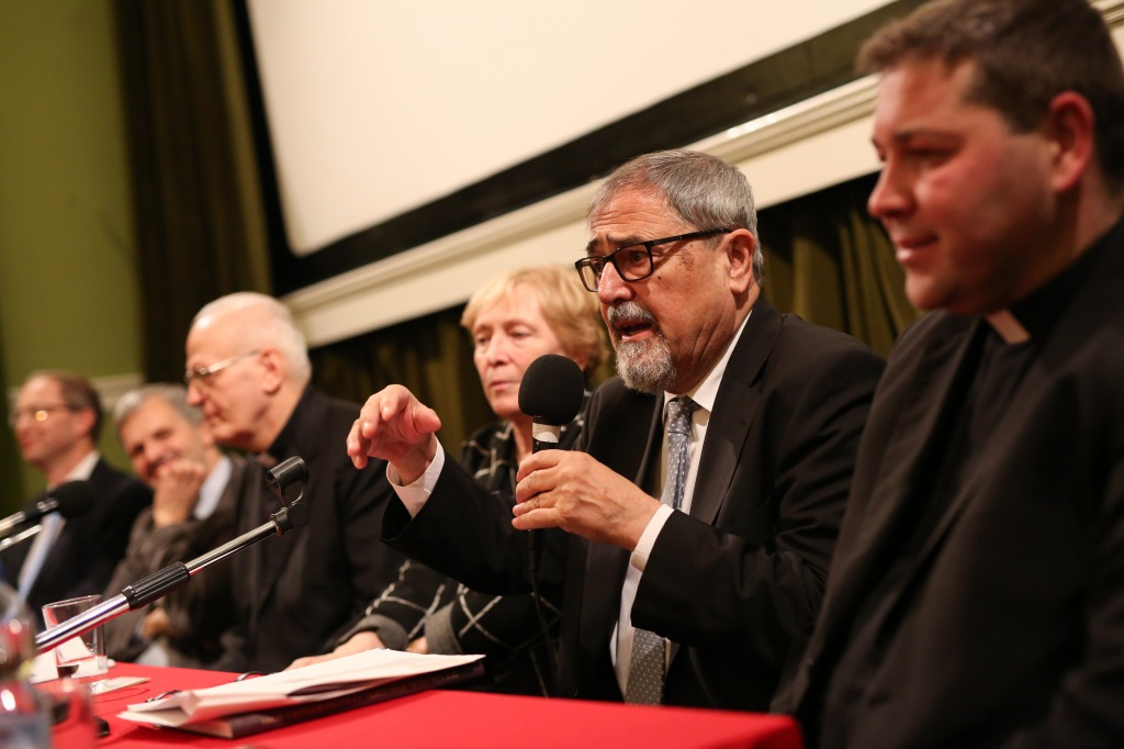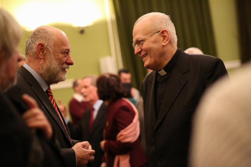 Erdő Péter bíboros, aki egykor maga is növendéke volt a Pápai Magyar Intézetnek, annak egyházban, egyháztörténelemben betöltött szerepéről tartott előadást. Mint mondta, nagy örömmel vette kézbe a most megjelent reprezentatív kötetet, amely felidézte benne az első alkalmat, amikor a Pápai Magyar Egyházi Intézetnek helyet adó második emeletre ment föl. Felérve azonnal azt az emléktáblát látta meg, amely arra emlékezteti a látogatót, hogy XIII. Leó a megválasztása előtti napokban itt szállt meg: a palota egyháztörténeti kapcsolatai tehát nem az intézet megalapításával kezdődtek el. A bíboros is megemlítette, hogy bárki, akinek megmutatja az épületet, csodálkozik azon, hogy a magyar állam és az egyház ilyen gyönyörű épület tulajdonosa lehet Rómában. Kiemelte, hogy az állam és az egyház együtt vett részt az intézmény megalapításában, hiszen 1927-ben a vallásalap pénzét is fölhasználták a palota megvásárlásakor, így kapott helyet benne a papi osztály. Az azóta eltelt időszakok hullámzó együttműködése, illetve a szocializmus idején, az 1964-es megegyezésig tartó ellenséges időszakban az állam ellenállása, a rendszerváltozás óta eltelt időszakban pedig a kapcsolat pozitív alakulása e könyvben nyomon követhető, a kötet megjelenése pedig az együttműködés megvalósulásának tekinthető.