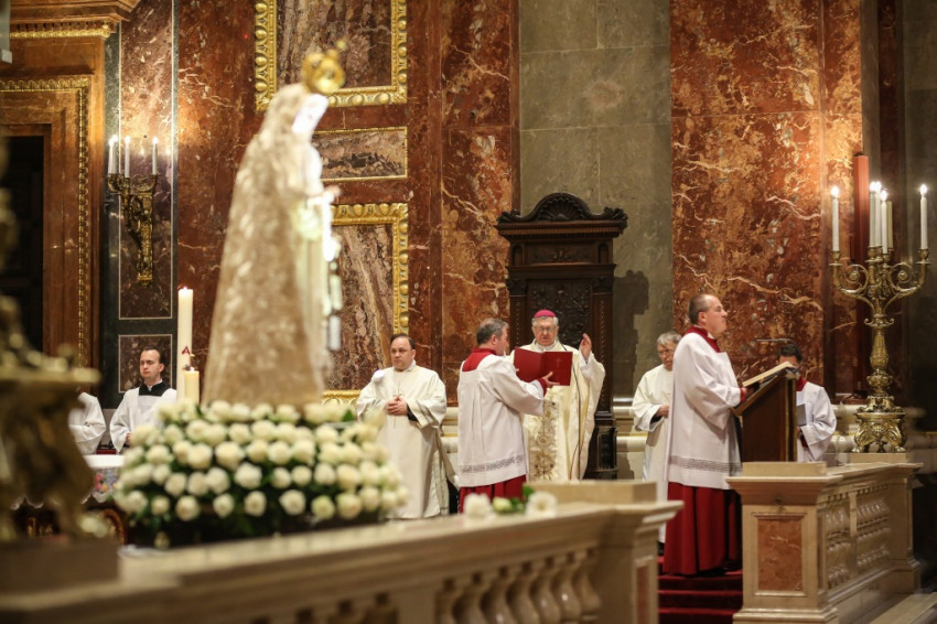 A kegyszobrot ünnepélyes menetben hozták be a Szent István Lovagrend tagjaitól kísérve, és elhelyezték a hívekkel szemben az szentélyben. A fehér rózsakoszorú övezte szobor előtt Snell György esztergom-budapesti segédpüspök imádkozott, a hívek a dicsőséges rózsafüzérrel köszöntötték a Szűzanyát.