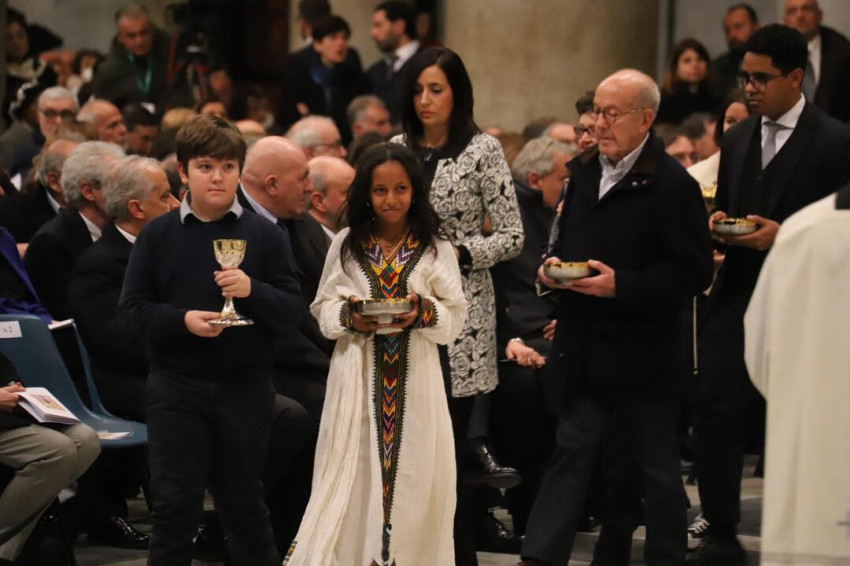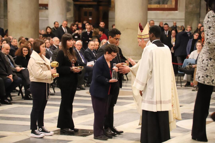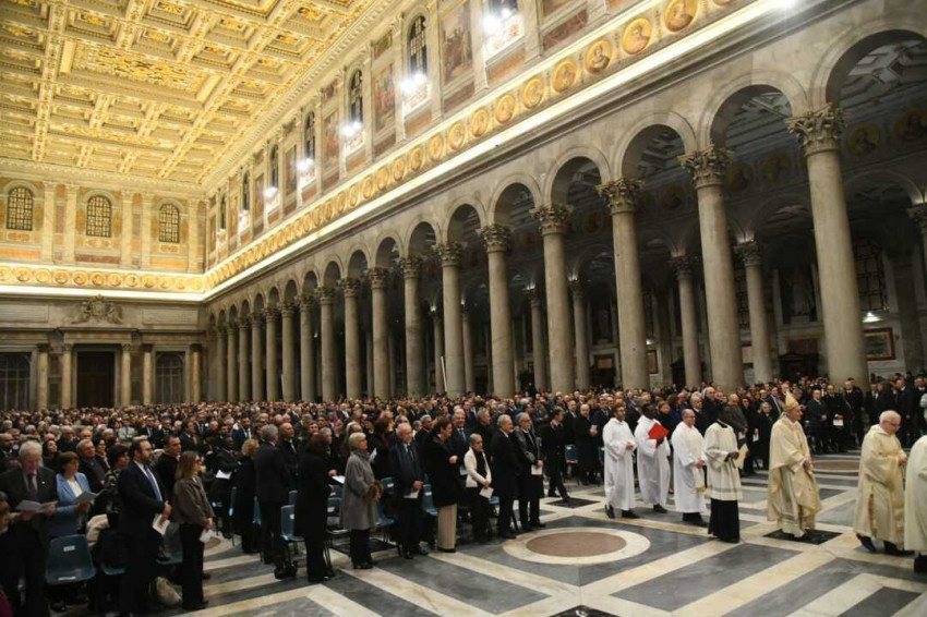 Matteo Zuppi bíboros a sziklára épített ház evangéliumi történetének felolvasását követően homíliájában kifejezte örömét, amiért a hatalmas bazilika még kicsinek is tűnik, olyan sok ember gyűlt össze hálaadásra a rengeteg ajándékért, amely a közösségen keresztül sokak életét fénylővé, boldoggá tette. „Egy nagy, egyetemes nép, az alázatosok és szegények népe, akik dicsérik az Urat, mert ingyen és érdem nélkül annyi jó vizet kaptak tőle. Olyan vizet, amely oltja a szomjat, sőt, magát a szívünket is forrássá teszi.”