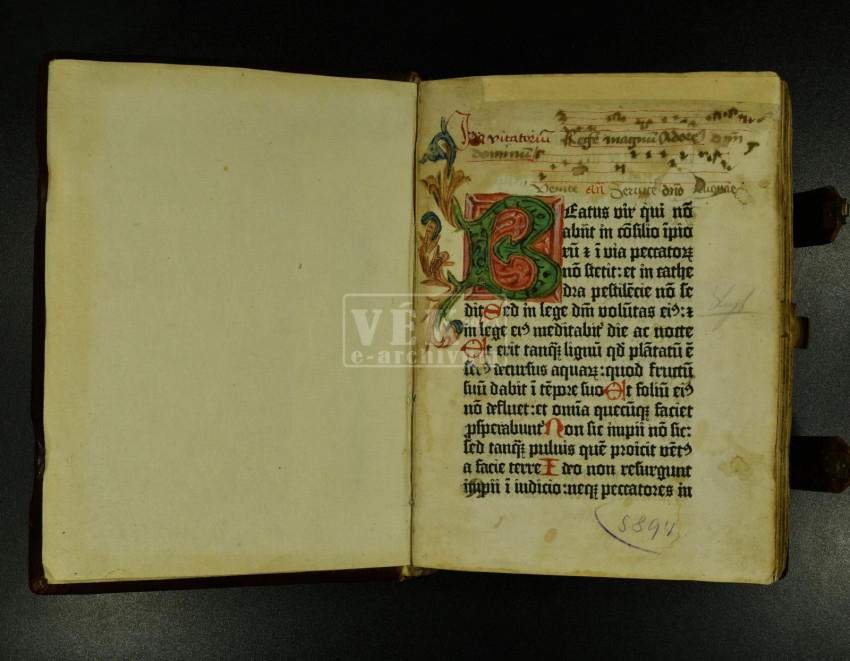 A zsoltárszövegeket fraktúrával, gót betűkkel nyomtatták, majd a rubricator kézzel festette meg az iniciálékat, amelyek közül kiemelkedik az első oldalon a többszínű B és a 112. lap rektóján látható, szakállas férfifejet ábrázoló D kezdőbetű.
