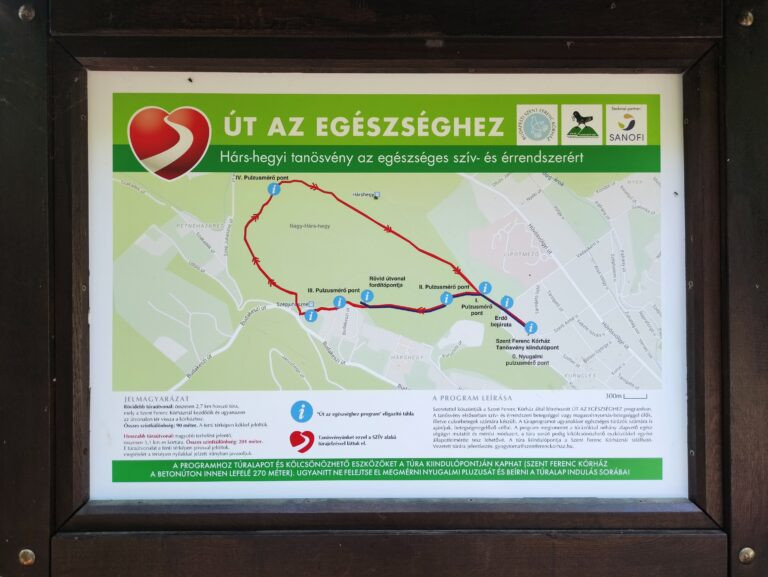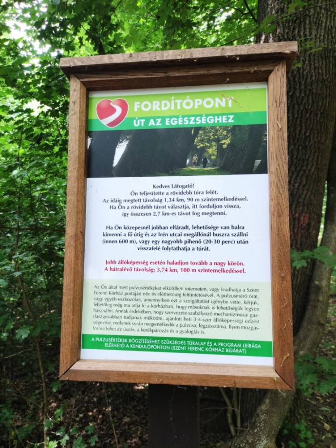 „A nehezebb szakaszok után pihenőpontokat találunk padokkal és táblákkal – ezek pontos iránymutatást adnak, hogy a pulzusmérés után mitévők legyünk: pihenjünk vagy bátran folytassuk az utat, vagy éppen merre kanyarodjunk, ha már elértük teljesítőképességünk határát – tette hozzá Viktória. – Mert nem muszáj sem a hosszabb (5 kilométeres), sem a rövidebb kört (3 kilométeres) megtenni, közben is vannak kivezető utak, így bátran elindulhat rajta mindenki; aki nincs hozzászokva a gyalogláshoz, az is. A fokozatosság elvének a betartása a mozgás terén nagyon fontos. Ebben segítenek a tanösvény iránymutató táblái, hogy megtaláljuk saját magunk ritmusát.”