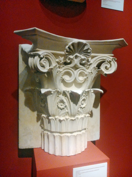 A kiállított gipszmakettek közül kiemelkedik egy görög amfiteátrum modellje a 20. század elejéről. Mesésen szép korinthoszi oszlopfőt láthatunk, amely az athéni Lüszikratész-emlékműről való. Aluról felfelé szélesedő, szépen restaurált a fejezete, stilizált növényi motívumokkal díszített, részletekben gazdag az egész műalkotás. Az oszlopoknak nemcsak az ókorban, hanem a 19. század építészetében is nagy volt a jelentőségük. Az oszlopfejezetek kialakítására, művészi megformálására nagy figyelmet fordítottak az építészek. Azt mondhatnánk, szinte önálló tudományág volt a dór, a jón és korinthoszi oszlopok tervezése és kivitelezése, hogy csak a legalapvetőbb oszloprendeket említsük. Ezért is láthatunk a kiállításon annyi rajzot ebben a témakörben.