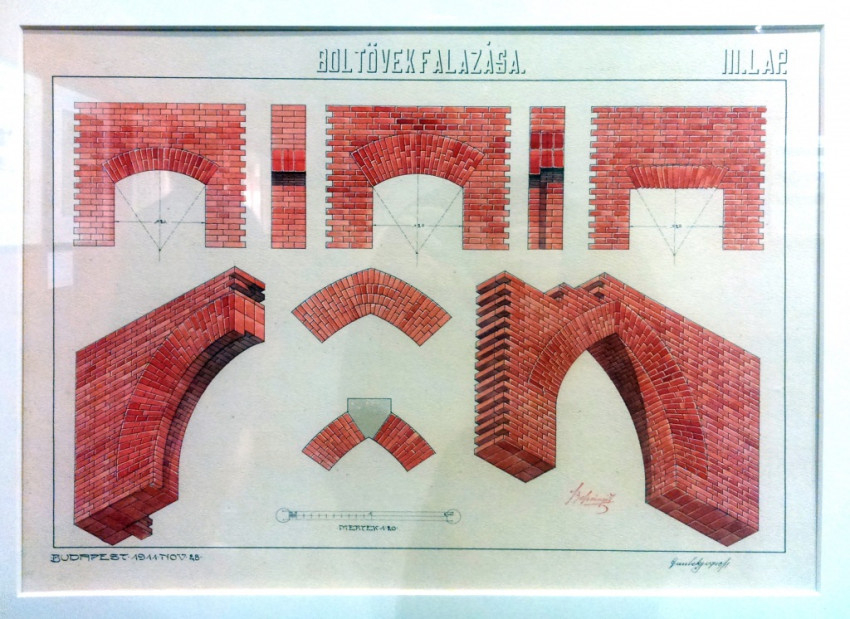 A történeti múzeum kiállításán kiváló rajzokat láthatunk. Auenhammer József kőművestanuló például a győri izraelita templom oldalhomlokzatáról készített méretarányos tusrajzot 1877-ben. Ki gondolná, hogy egy kőművesnek ilyen képességekre és tudásra volt szüksége akkoriban? Más világ volt akkor, a téglaépítészet idején, nagyon sok múlott a házakat kivitelező kőműveseken. Ha meggondoljuk, ma is így van ez: hiába a kiváló építészeti terv, ha nem megfelelő színvonalú a kivitelezés. Az iparostanoncoknak nemcsak szakszerűen kellett „olvasniuk”, érteniük a tervrajzokat, hanem ismerniük illett a stílusokat, és adott esetben maguknak is kellett terveket készíteniük. Kiss Mihály kőműves Boltövek falazása (1910) című akvarellje egyszerűen lenyűgöző munka.