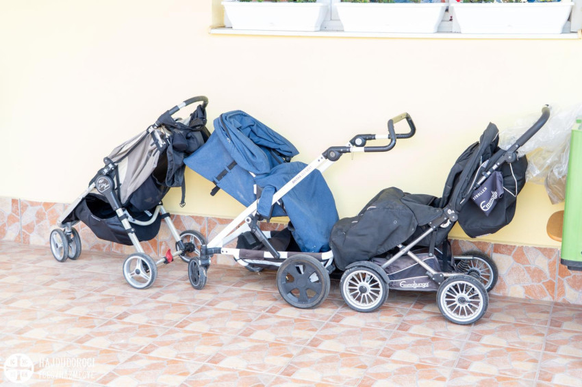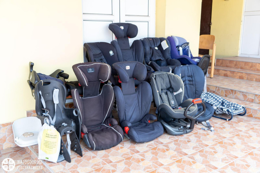 A Gondoskodó Szeretet szociális és adománybolt udvarára belépve sportoláshoz, szabadidős tevékenységekhez használható eszközök, továbbá babakocsik és autós gyerekülések sorakoznak.