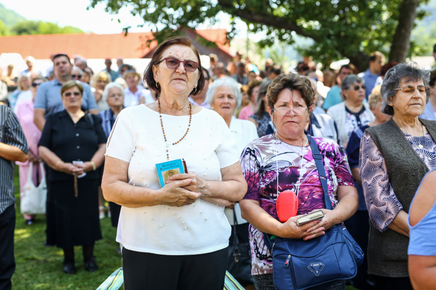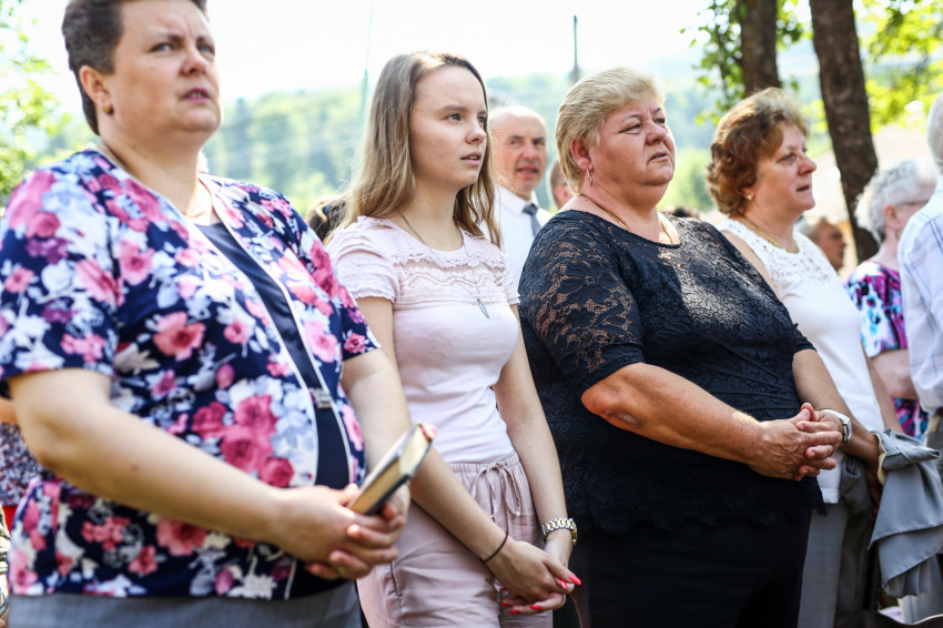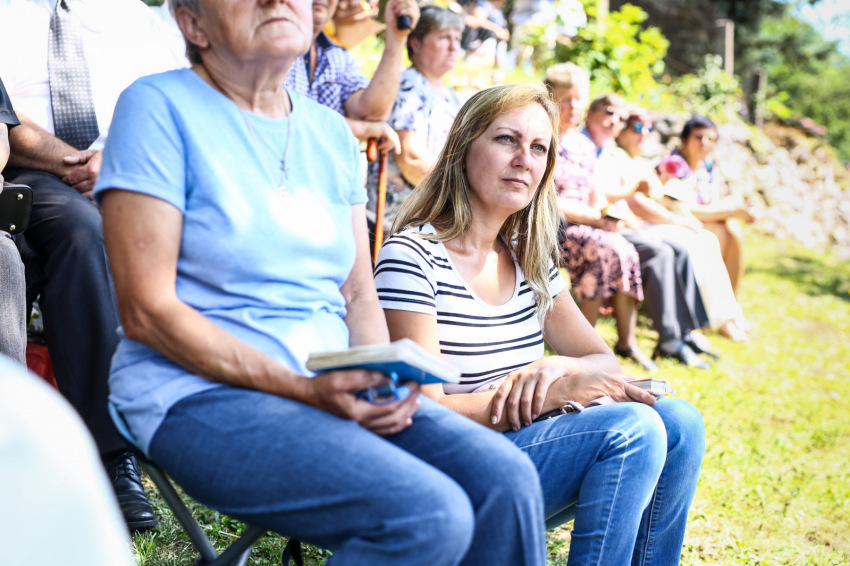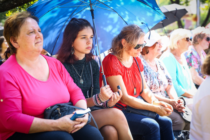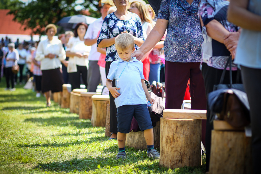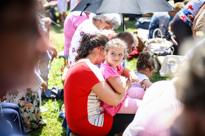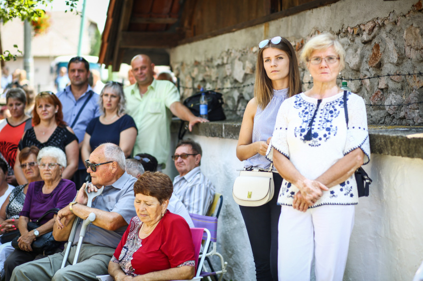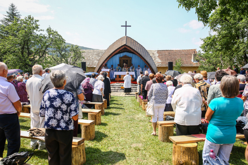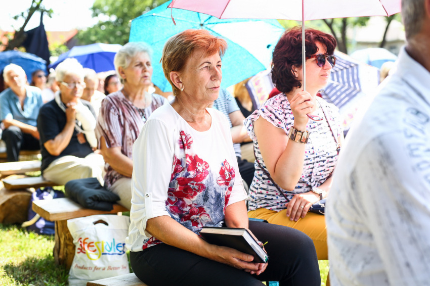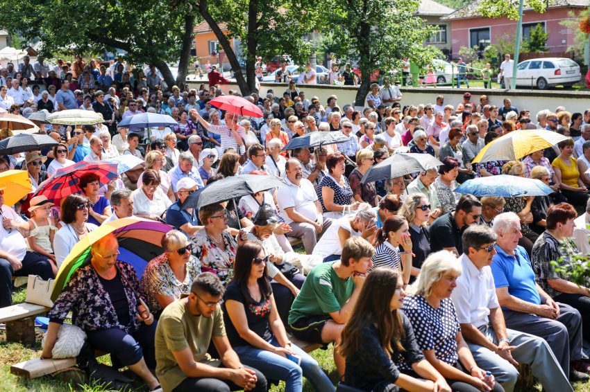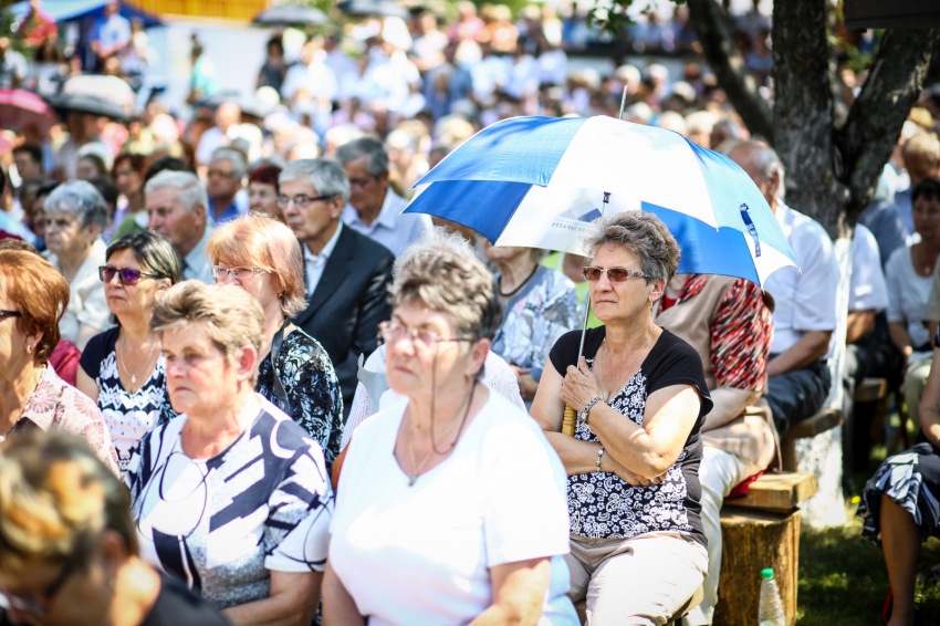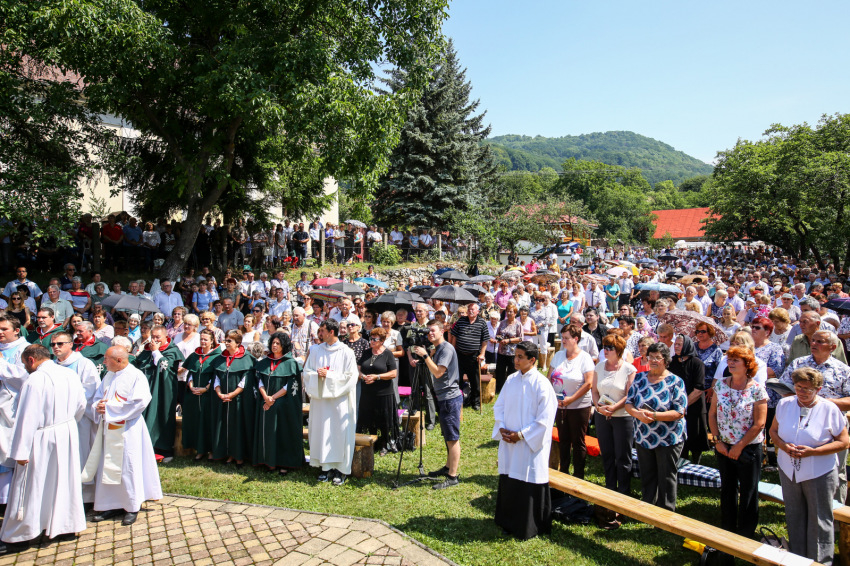 A misét a templom alatti kertben tartják, és teljesen megtelik: ezer feletti a tűző napon sok-sok színes ernyőt fejük fölé tartó zarándokok létszáma. Eigel Gábor plébános köszönti a megjelenteket „a magyarok egyik legnagyobb búcsújáró helyén”, majd Cserháti Ferenc püspök beszél arról a közösségélményről, amelyet nyugat-európai és amerikai útjain és itt egyaránt megél: az összmagyarság összetartozásáról, a Szent István-i örökségről.