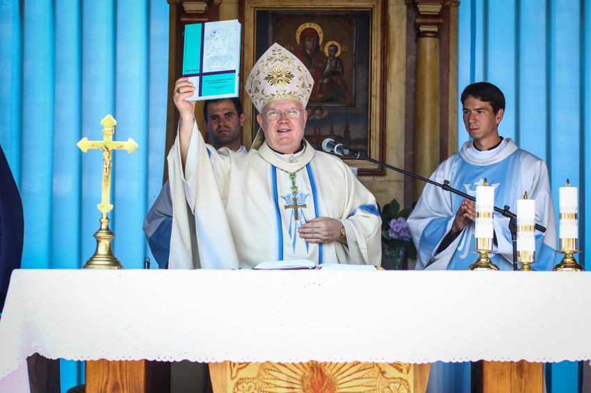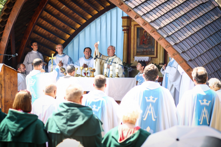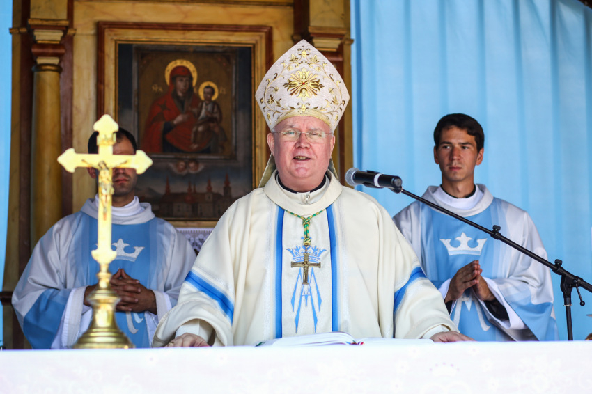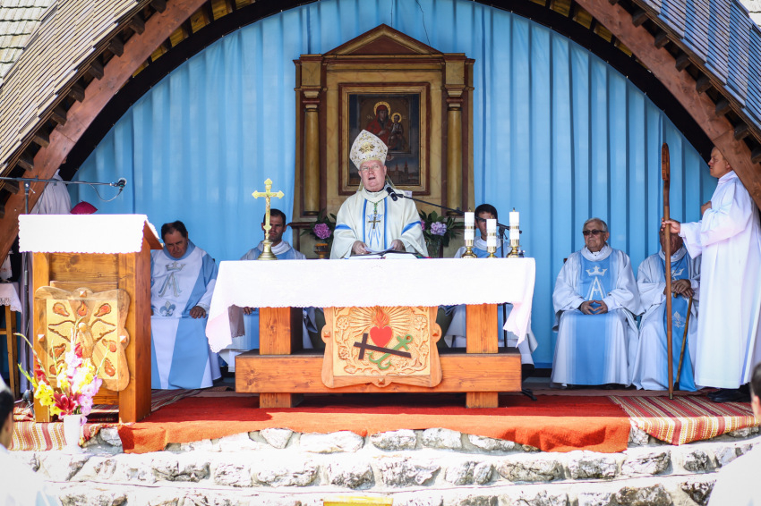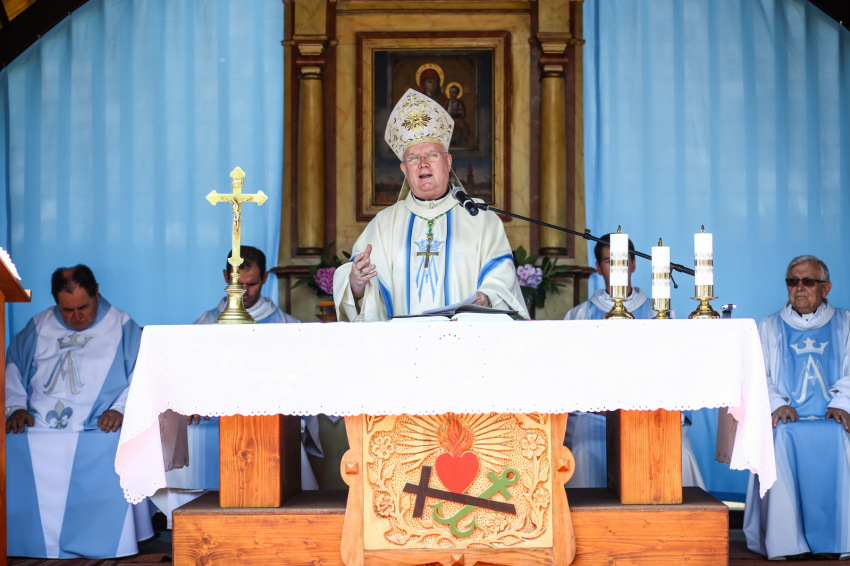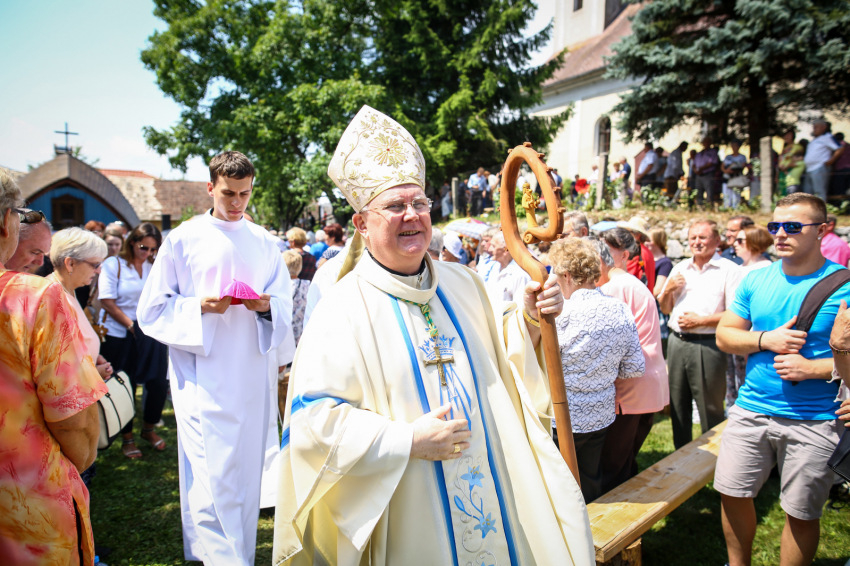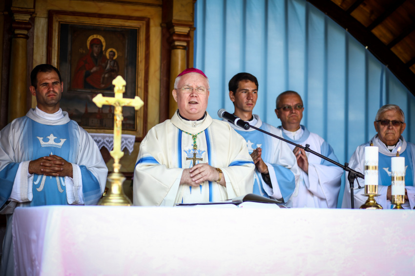 A kegyhelyek szentélyek; olyan gyógyforrások, amelyekből már elődeink is ittak, és felfrissültek, új erőre kaptak, hitre leltek tőle – kezdi prédikációját a püspök. – Amikor ide, a Skapulárés Kármelhegyi Boldogasszony szentélyébe jöttünk, hazajöttünk – mint az elmúlt 260 év során az őseink oly sokszor –; azért, hogy oltalmat, megerősítést kérjünk. A kegyelmek Anyjához fordulunk, hogy a kánai menyegzőhöz hasonló közbenjárását kérjük, és Jézus akár csodát is tegyen velünk itt ma. A galileai Kármel hegyen a horizont kitágul, új távlatok nyílnak. Ott mutatott be Illés próféta élő áldozatot az egyetlen, igaz Istennek, és ott győzte le Baál papjait. Később pedig remeték hegye lett a Kármel.A skapuláré vállon hordható ruha és érmecske, amely a kármelita rendhez kapcsolódik. Aki felölti, Jézust ölti magára, Krisztust, Mária hitét és szeretetét akarja önmagában és tettei által megjeleníteni. Jézus égi édesanyát adott nekünk. Szeretjük-tiszteljük őt, mert igent mondott Isten akaratára. Mária a fiára mutat, és azt kéri tőlünk: „Tegyetek meg mindent, amit mond.”