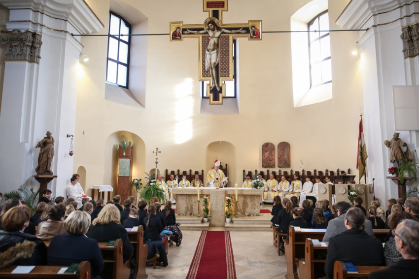 – Ünnepi izgalommal állunk itt – mondja Blanckenstein György plébános a bevonulás után –, hiszen huszonötödik jubileumot ülünk ma, amely egy ember, de még egy iskola életében is nagy idő. Megtiszteltetés, hogy bíboros úr eljött közénk örömünkben osztozni.