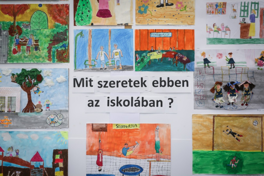 Mi pedig, miután az ünnepi megemlékezés hivatalos része lezárul, a kis kiállítás tanulmányozásába kezdünk, amely jeles pillanatokat megörökítő fényképekből, régi újságcikkekből és a gyerekek „Mit szeretek ebben az iskolában?” kérdést megválaszoló rajzaiból áll. Az egyik rajzon éppen gólt rúg egy kisfiú, miközben a kapus az ellenkező irányba vetődik, a másik képen piros, kék, lila levelű fák alatt lányok táncolnak, ugróköteleznek, egy harmadikon tábortűz ég. Mellette iskolai füzetet ábrázoló kép, amelybe alkotója ákombákom betűkkel ezt írta: „Peti ma ötöst kapott. Megörült nagyon. Anyukája megdicsérte. Juli beteg volt. Peti meglátogatta.”