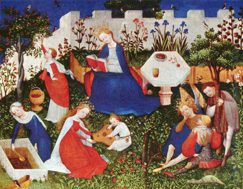 Ez a festmény egy ismeretlen rajnai festő műve, a Paradicsomkertecske, amely 1410 körül keletkezett. A gyönyörű látványnak egy 26,3 x 33,4 centiméteres tölgyfalap ad otthont. A festmény tojástemperával és olajfestékkel készült, s a frankfurti városi galériában látható. Jómagam sok-sok évtizeddel ezelőtt művészettörténész édesanyám egyik könyvében találkoztam vele. A pontos szakmai adatokat Békési Sándornak, s egykori kedves kollégámnak, Németh István művészettörténésznek köszönöm.