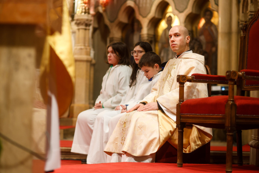 A szertartás bevezető részében felidézte, hogy vasárnap ő is a koncelebráló papok között volt a pápai szentmisén, és most is azt a – Fecske Orsolya festőművész által tervezett – gyönyörű miseruhát viseli, mint akkor. „Még itt él a szívünkben Ferenc pápa látogatása, azok a buzdításai, intelmei, tanításai, amelyeket nekünk, magyaroknak elmondott” – fogalmazott az esperes.