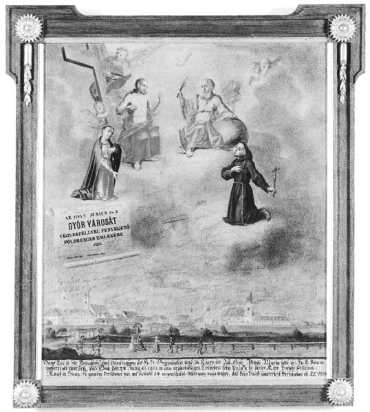 A mariazelli kincstárban őrzik a város fogadalmi képét. Ennek alsó mezőjében Győr látképe látható nyugatról, a kármeliták templomának megdőlt tornyával. A városkép előterében egy út menti feszület előtt imádkozó, illetve riadtan menekülő emberek vannak. A képet a győri Szentháromság Konfraternitás készíttette. Ezt erősíti az alsó rész német nyelvű szövege is, mely megmagyarázza a képen látható eseményt, a votívkép felajánlásának okát.