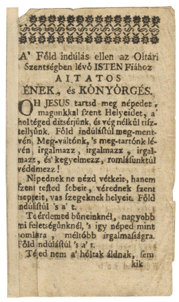 E rövidebb imák mellett az 1767–1790 között keletkezett kéziratos Ekeli gyűjteményben fennmaradt egy hosszú imádság is. Ennek nemcsak címe – Föld Induláskorra való Imádságok a Győriek[ne]k –, hanem a szövegben megnevezett Comarom is egyértelműsíti, hogy az 1763-as győri földrengésre vonatkozik.