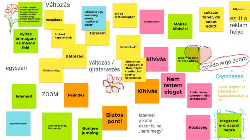 A közel kétórás együttlét Csíki Szabolcs ifjúsági lelkész köszöntésével kezdődött, aki hálatelt szívvel köszönte meg a csapat kitartását, munkáját. Majd egy virtuális táblán ki-ki rajzzal, egy-egy szóval, mondattal fejezte ki, mi jut eszébe a 2020-as „FIF-es évéről”.