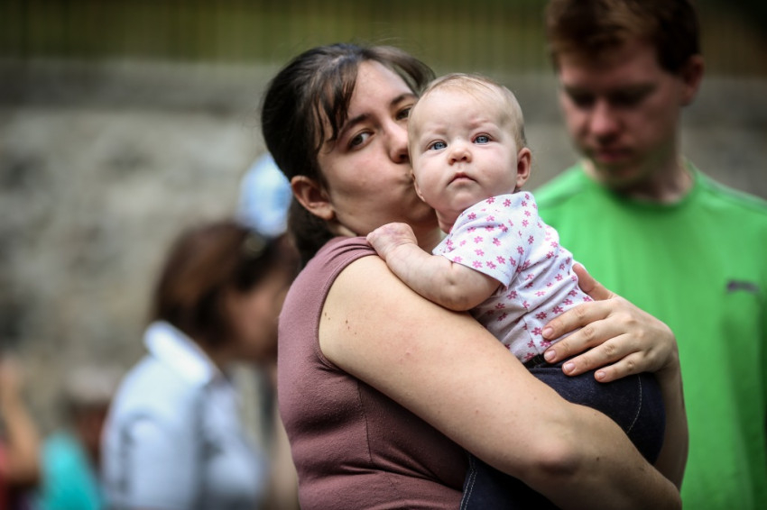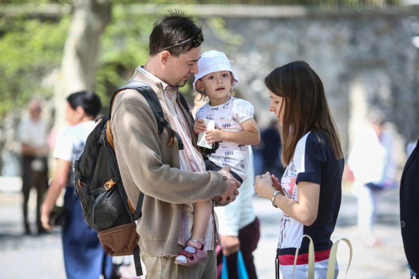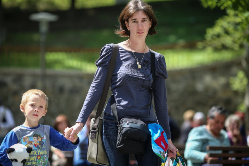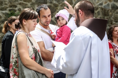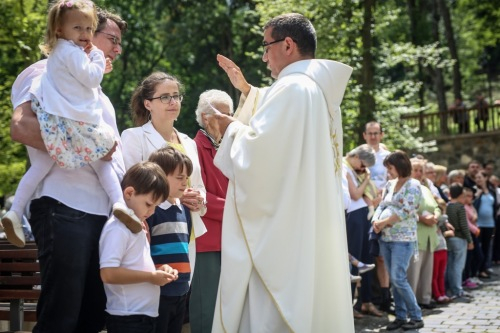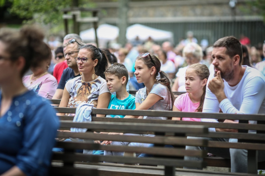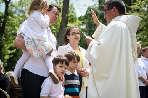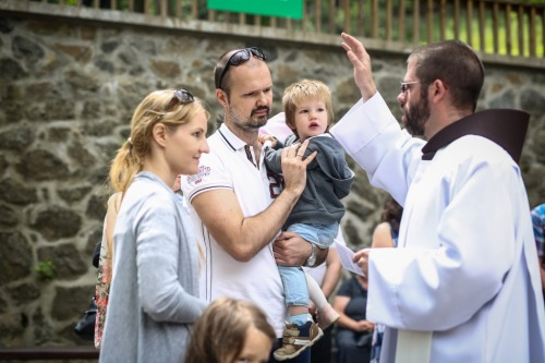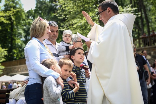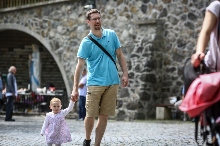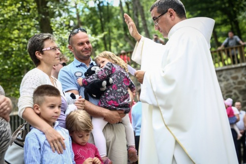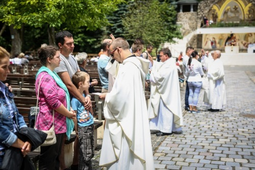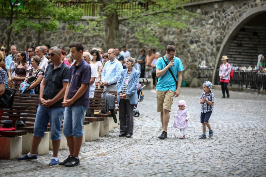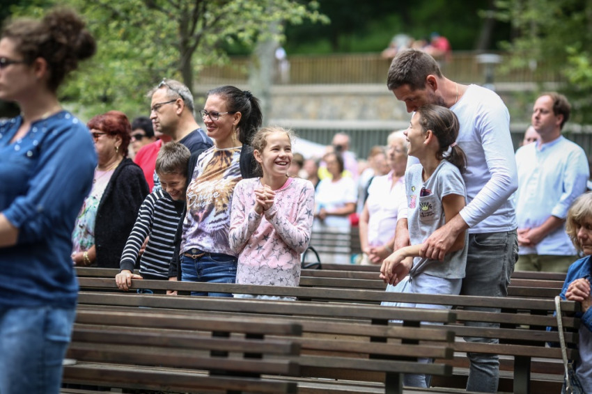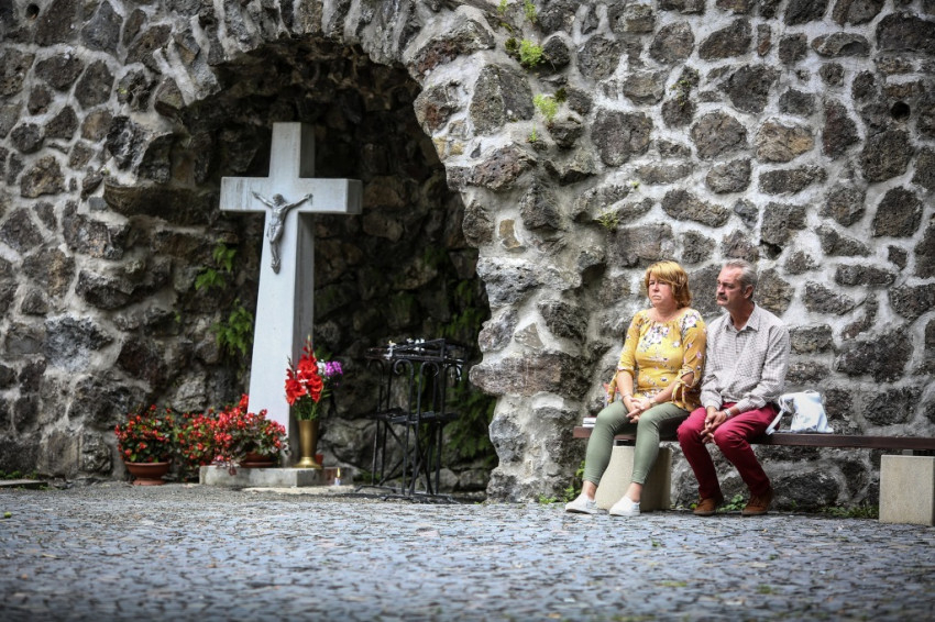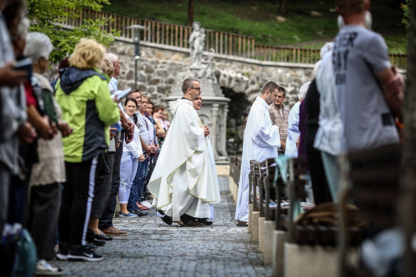 A kicsiny falu, Mátraverebély melletti Szentkút, nemzeti kegyhelyünk saját külön világ. Egyrészt olyan, mint egy üdülőhely, másrészt amikor a szabadtéri oltárhoz ér az ember, hirtelen szinte rászakad az erdő, és a természet templomában találja magát. A külön világ érzetét erősíti a bejáratnál a „határőrök” jelenléte és a feltorlódó autósor. Lassan jutunk be, a zarándokház melletti parkolóban pedig épp hogy csak találunk szabad helyet. Minden irányból anyukák, apukák, nagymamák és nagypapák érkeznek, csatlakoznak hozzánk; rengeteg a kisgyerek, sőt azt mondhatnám, hogy ők vannak többségben – a négy-hat-nyolc évesek. Három nemzedékkel jelen levő családokat is látok; a szívesen elkódorgó gyerekeket hol a nagymama, hol az anyuka hajkurássza. Egész biztosan mindig csak a karonülők vannak meg, mert ez a környezet túl csábító az egy helyben maradáshoz, felfedezésre vár.
