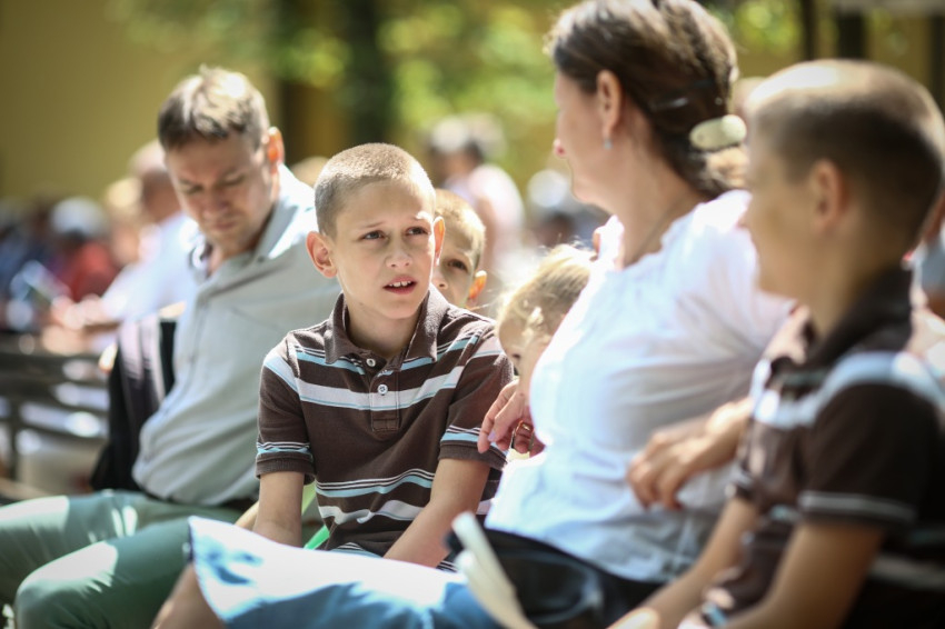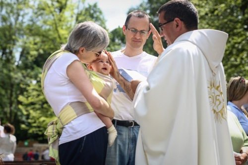 Miközben a prédikációt hallgatom, egyfolytában történik valami – így megy ez, amikor sok gyerek van egy misén. A fa körül, amelynél ülünk, egy kislány rohan körbe-körbe, de olyan odaadással, küldetéstudattal, mintha ez lenne a munkája. És csakugyan, mint nemrég ráébresztettek: a gyerek munkája a játék. Ezt kell a legkomolyabban csinálnia ahhoz, hogy később jól helytálljon például az iskolában. Sokan az oltárral szembeni hegyoldal sétányán, a korlát mellől hallgatják a misét, így a felnőttek részvétele összeköthető a gyerekek kalandozásával, de azért az egyik szemüknek mindig a gyerekeken kell lennie, főleg amikor fel akarnak kapaszkodni a korlátra, nehogy kiessenek. Egy fa tövében két kislány játszik. Egyikük a kavicsokat rakosgatja, a másikuk a fatörzséről kapargat le valamit. Mindketten nagyon elmélyülten dolgoznak.